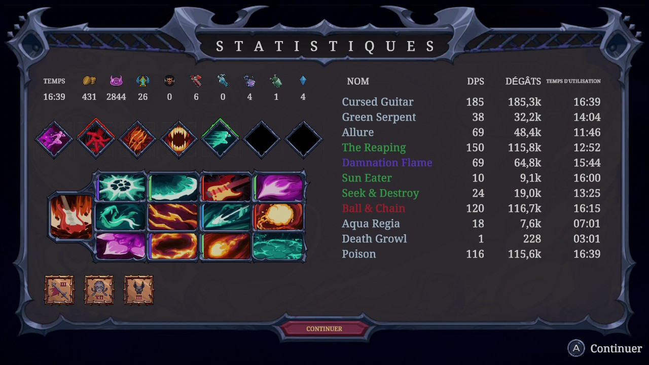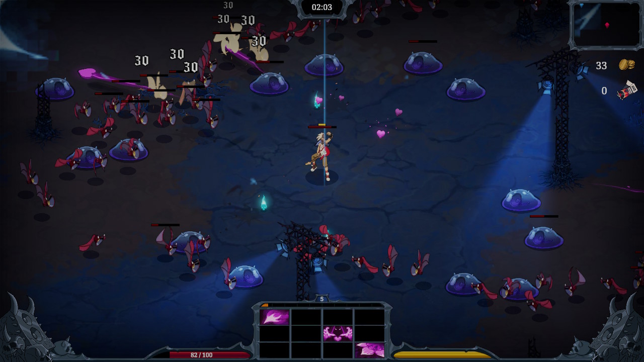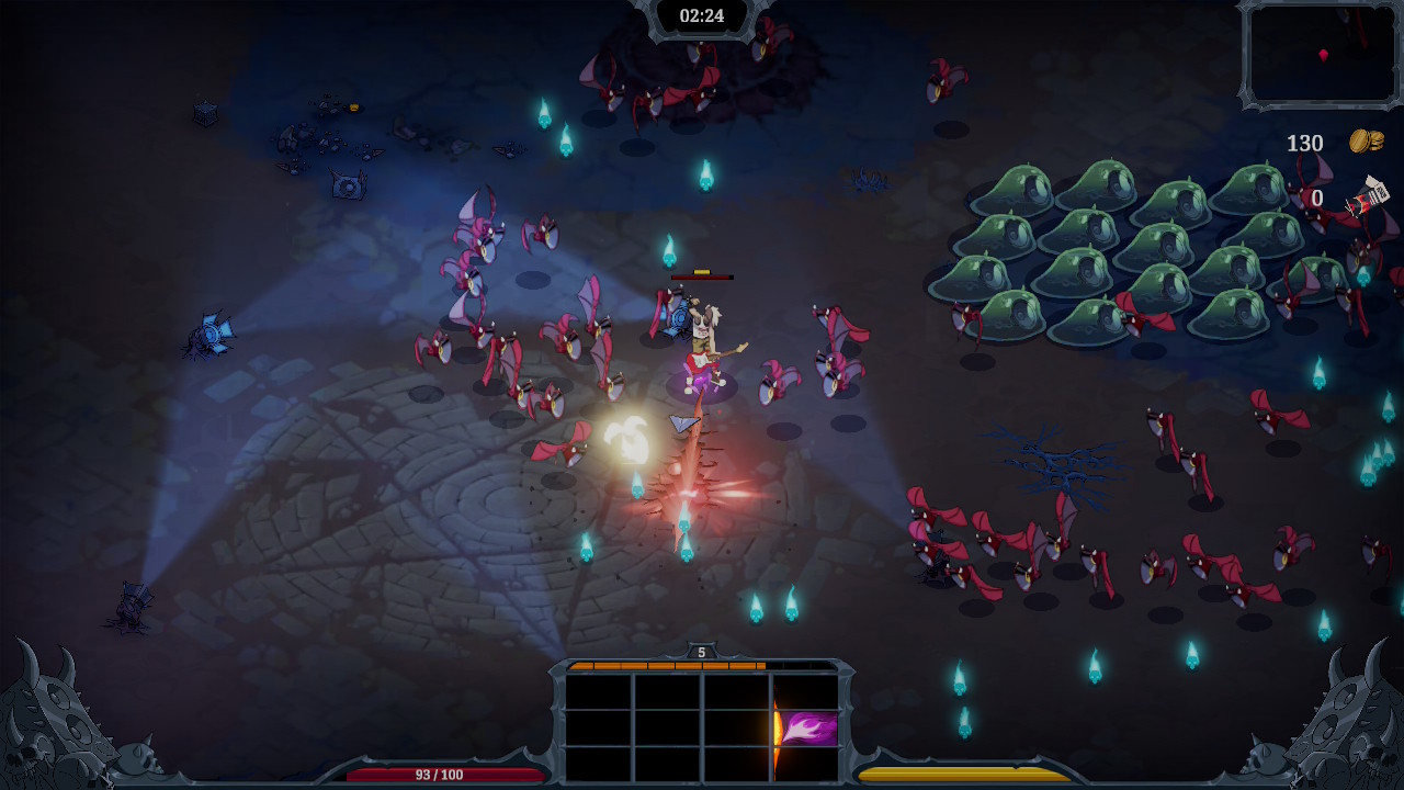 Ce qui distingue Devil Jam est que, une fois le pouvoir choisi (une arme ou une amélioration), nous devons le placer sur une grille qui représente les frettes d’une guitare. Chaque coup de corde active la frette où le pouvoir a été placé, il y a donc un petit aspect stratégie qui demande de bien disposer ses pouvoirs sur la grille. Étant un auto battler, le personnage active les frettes automatiquement en alternance et les attaques se déclenchent successivement sans avoir besoin d’appuyer sur quoi que ce soit. Il suffit d’éviter les vagues d’ennemis, de cueillir les cristaux d’XP et de bien choisir ses pouvoirs.