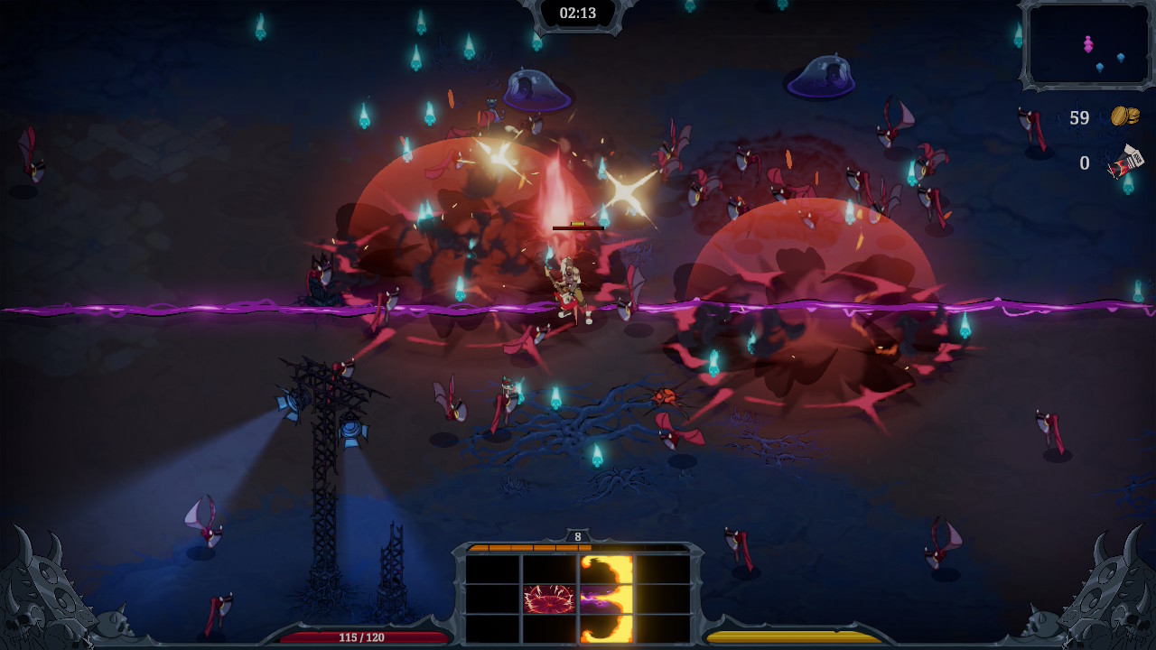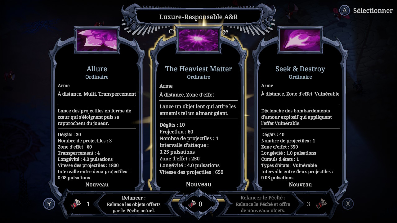 Au niveau des mécaniques de jeu, encore là, on ne réinvente rien. Un revoit sous un angle légèrement différent des concepts déjà visités maintes fois. Comme je l’ai déjà mentionné, il s’agit d’un Survivors-like et c’est peut-être un peu là le problème. Mécaniquement, il ne se distingue pas assez des autres jeux du genre. Vous êtes sur un grand terrain presque vide avec des vagues de bestioles que vous devez éviter et éliminez. On récolte les essences pour monter de niveau, et chaque fois, on espère tomber sur le péché qu’on voudrait et qu’on a choisi parmi les pouvoirs qui nous sont offerts.