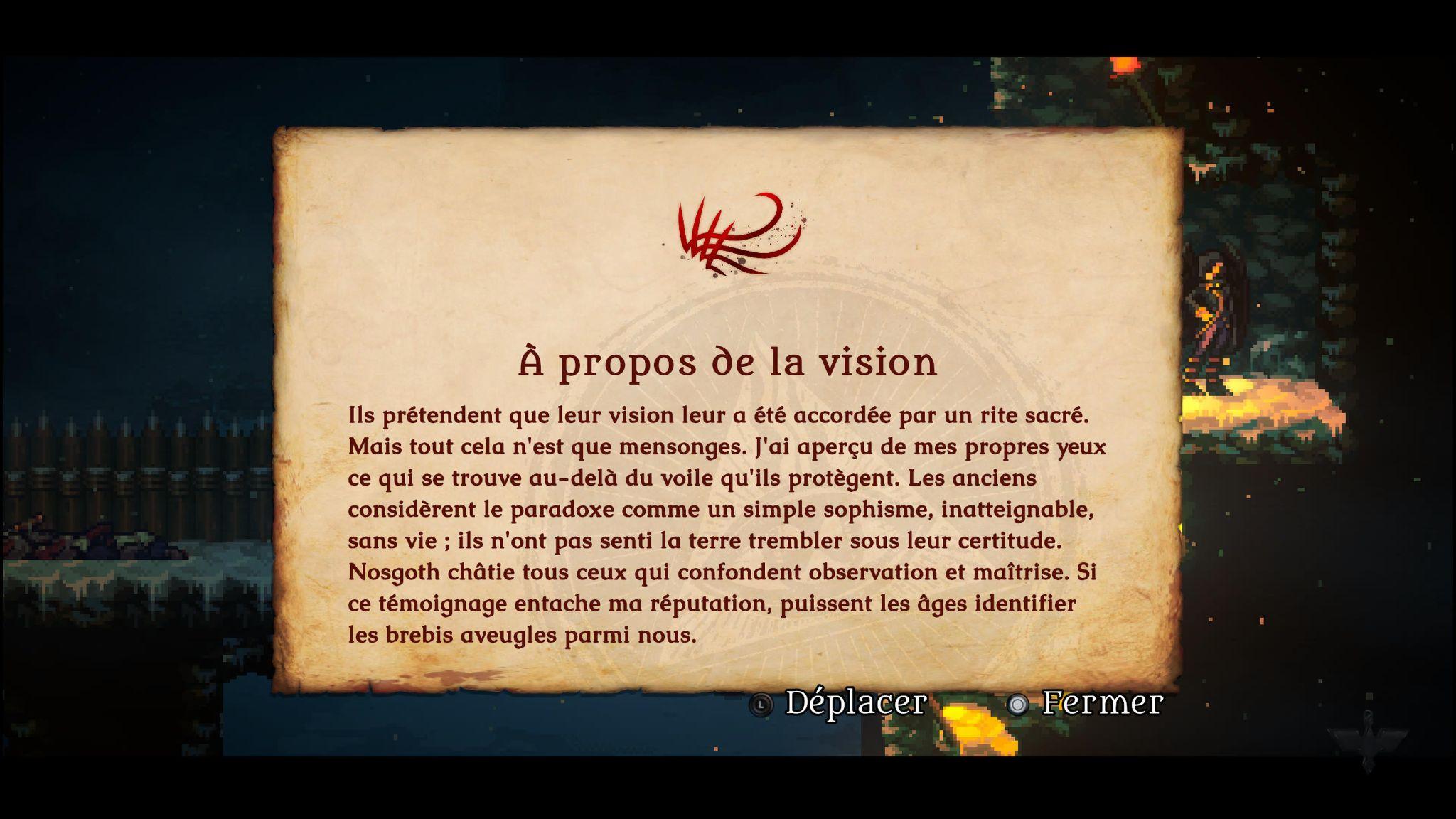 Pour être honnête, je dois dire que les joueurs intéressés auraient probablement intérêt à attendre un rabais. J’ai terminé le jeu en environ cinq heures, et ceci inclut les captures d’écran et la prise de notes pour cet article. Pour un jeu récent, je m’attends généralement à une expérience plus marquée, soit en ayant des défis, une histoire particulièrement captivante ou une identité artistique forte. Dans ce cas-ci, je n’ai pas ressenti de réelle satisfaction du côté de l’histoire. Mis à part l’introduction d’un nouveau personnage, le jeu n’apporte pas beaucoup de profondeur supplémentaire à l’univers déjà établi par les titres précédents. En ce qui concerne le challenge, une fois que l’on comprend les mouvements des ennemis et que l’on maîtrise les périodes d’invincibilité, le jeu devient rapidement trop facile. Puis, il y a les améliorations qui sont peu perceptibles et qui peuvent même être manquées, puisqu’elles sont souvent cachées derrière des murs destructibles secrets. Vous aurez au moins à chercher, ce qui allonge le jeu, mais c’est aussi un peu frustrant de trouver une simple note derrière un mur et de manquer d’autres passages qui procurent des améliorations plus vitales. Au final, Legacy of Kain: Ascendance est un projet intéressant sur le papier, mais il manque d’ambition dans son exécution. Sa jouabilité trop simple, son manque de variété et sa courte durée de vie rendent l’expérience difficile à recommander au prix demandé de 25.99$. Les fans de la franchise pourraient y trouver une certaine curiosité narrative, mais, pour la majorité des joueurs, il s’agit d’un épisode qui risque de laisser une impression plutôt défavorable. C’est un titre qui semble excitant, mais qui n’arrive pas à tenir sa promesse d’aventure. Cela étant dit, je lui donne la note de 5 sur 10.