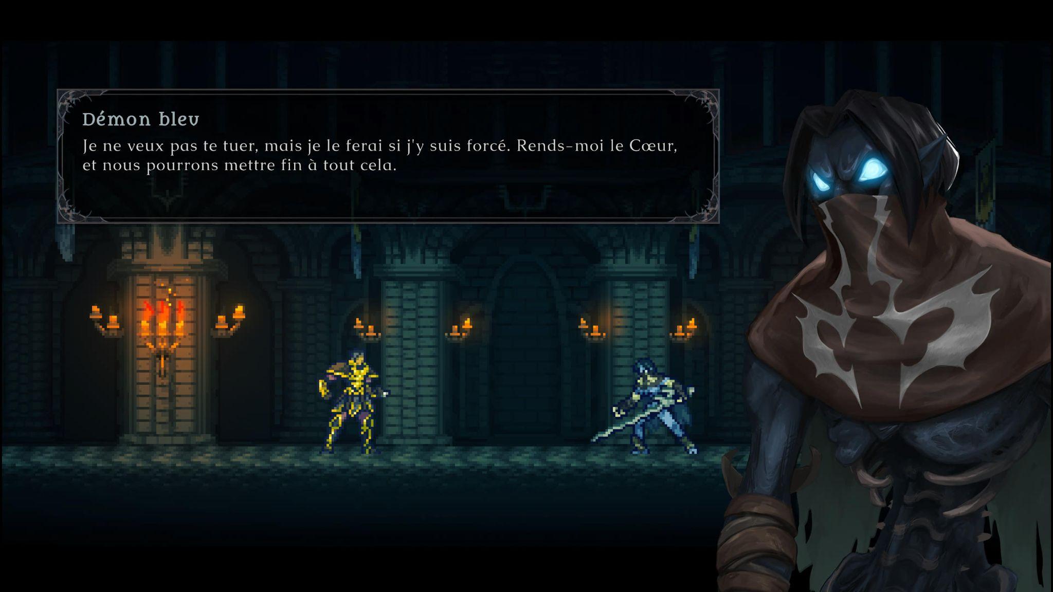Le tutoriel est bien conçu et explique les mécaniques du jeu étape par étape. Le joueur apprend progressivement comment attaquer, absorber de la vie, effectuer un double saut ou encore parer les attaques. Les mouvements disponibles restent relativement simples. Le joueur peut avancer, reculer, s’accroupir, sauter et utiliser un dash. Il est également possible d’attaquer et de parer. Selon le personnage, par exemple, si vous jouez un vampire, il est aussi possible d’absorber la vie des ennemis, une fois ceux-ci vaincus. Cette dernière mécanique n’est toutefois pas disponible lorsque Raziel est sous sa forme humaine. Si votre personnage a des ailes, vous pouvez aussi planer pour ralentir sa chute et effectuer des doubles sauts.