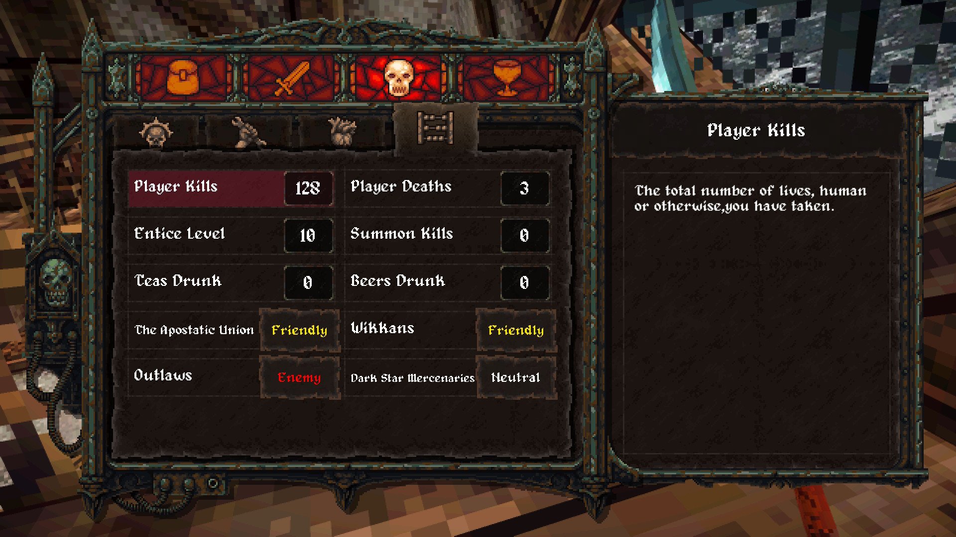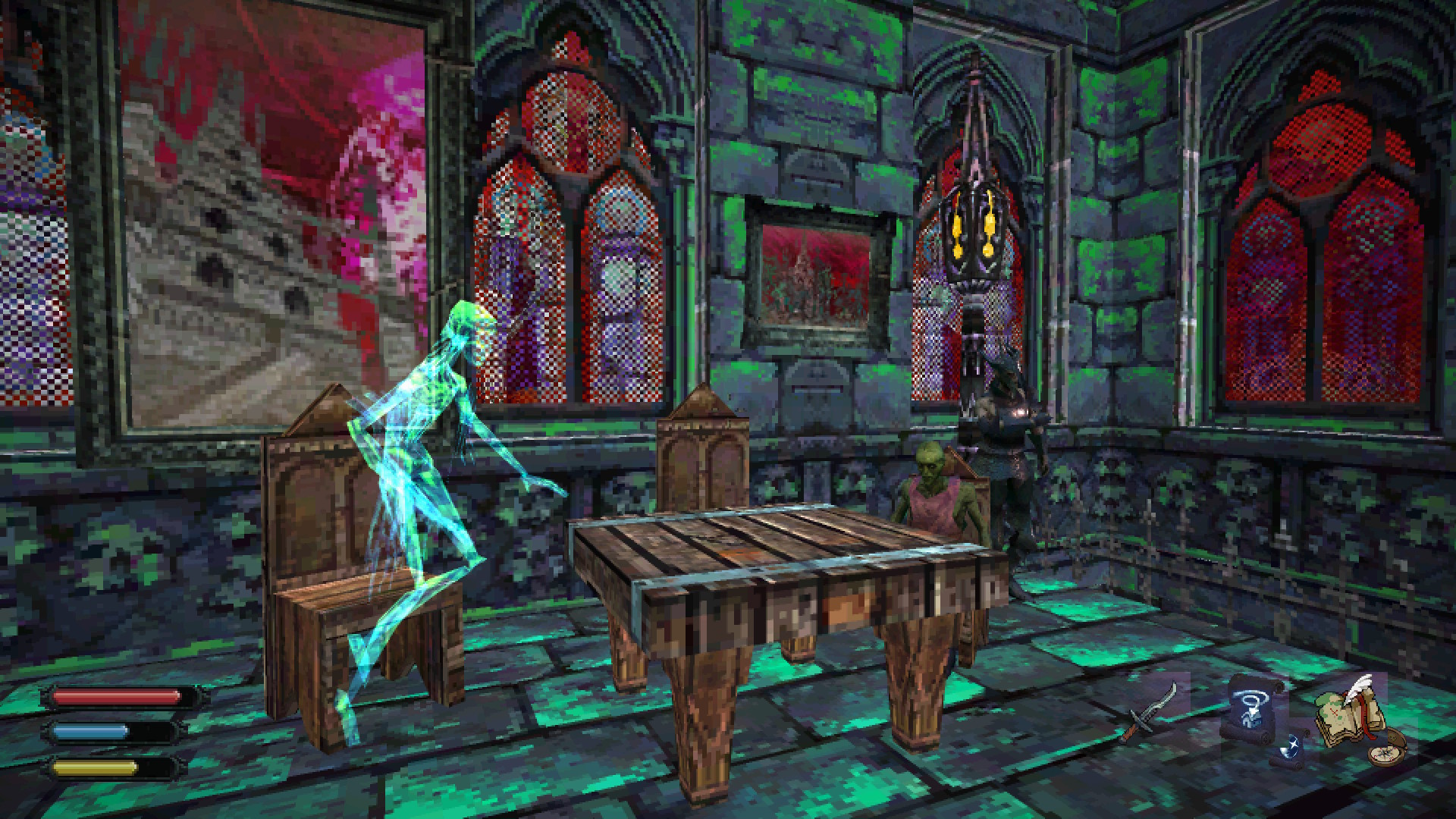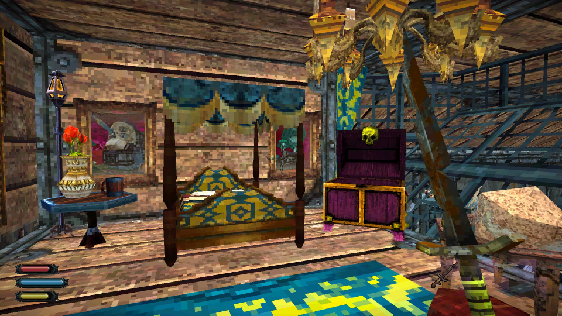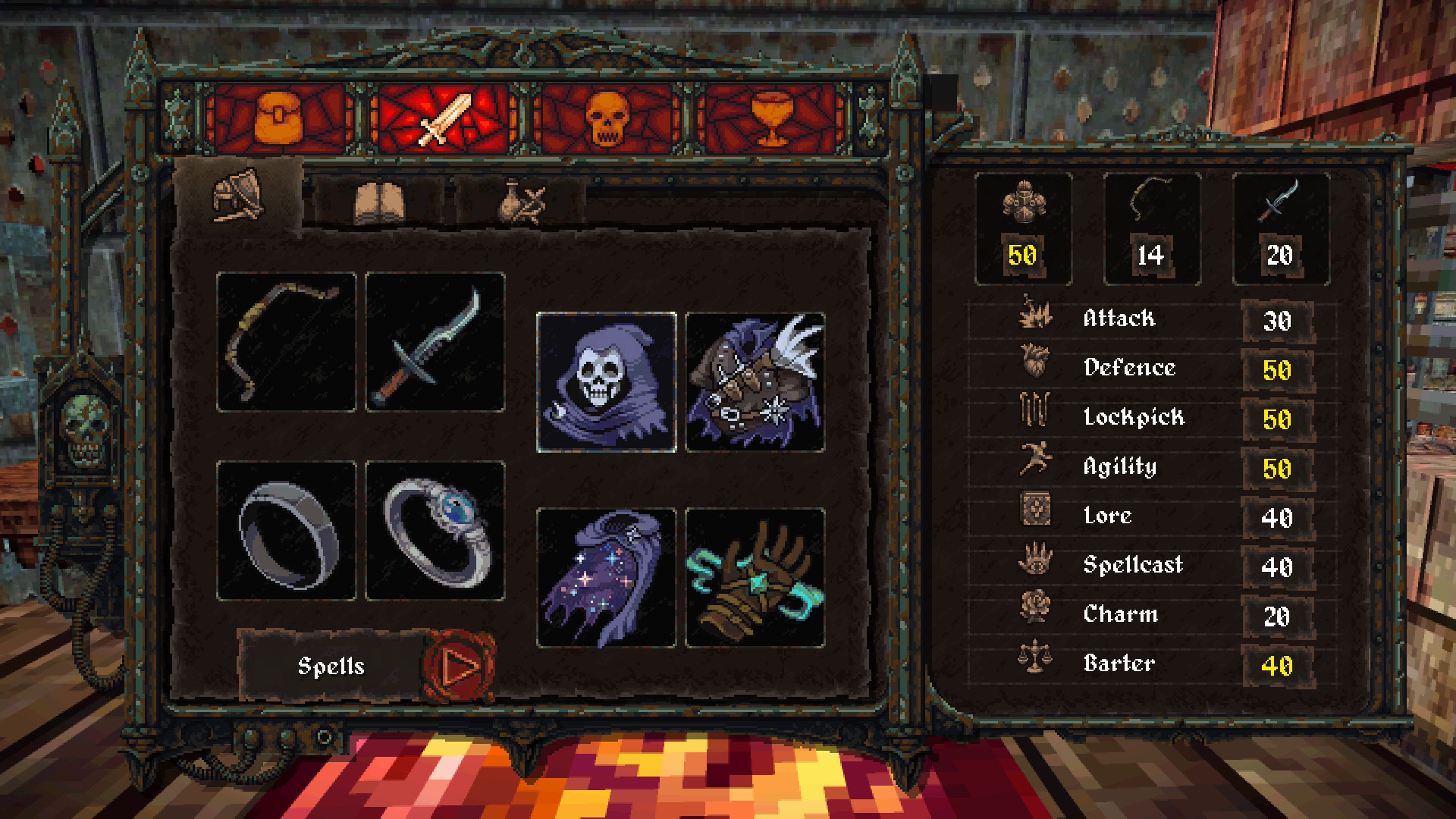 Dread Delusion mise tout sur l’exploration. En fait, le titre est vendu comme un mélange de jeu de rôle et de simulateur de marche. Vous passerez donc la majorité de votre temps à explorer et c’est ce qui m’a le plus attiré. L’expérience se gagne principalement en explorant. Les points d’XP sont remplacés par des crânes que vous trouverez un peu partout derrière des portes verrouillées et des passages secrets. Une fois cinq crânes trouvés, vous obtiendrez un point à attribuer à l’une de vos statistiques, soit la force, la dextérité, la magie et le charisme. Entrer dans une maison et voir une pièce inaccessible est toujours un régal. Vous devrez souvent bien chercher afin de trouver des chandeliers à tirer qui activeront un mécanisme ou un passage secret qui vous permet d’accéder à la pièce dans laquelle se trouve le butin.