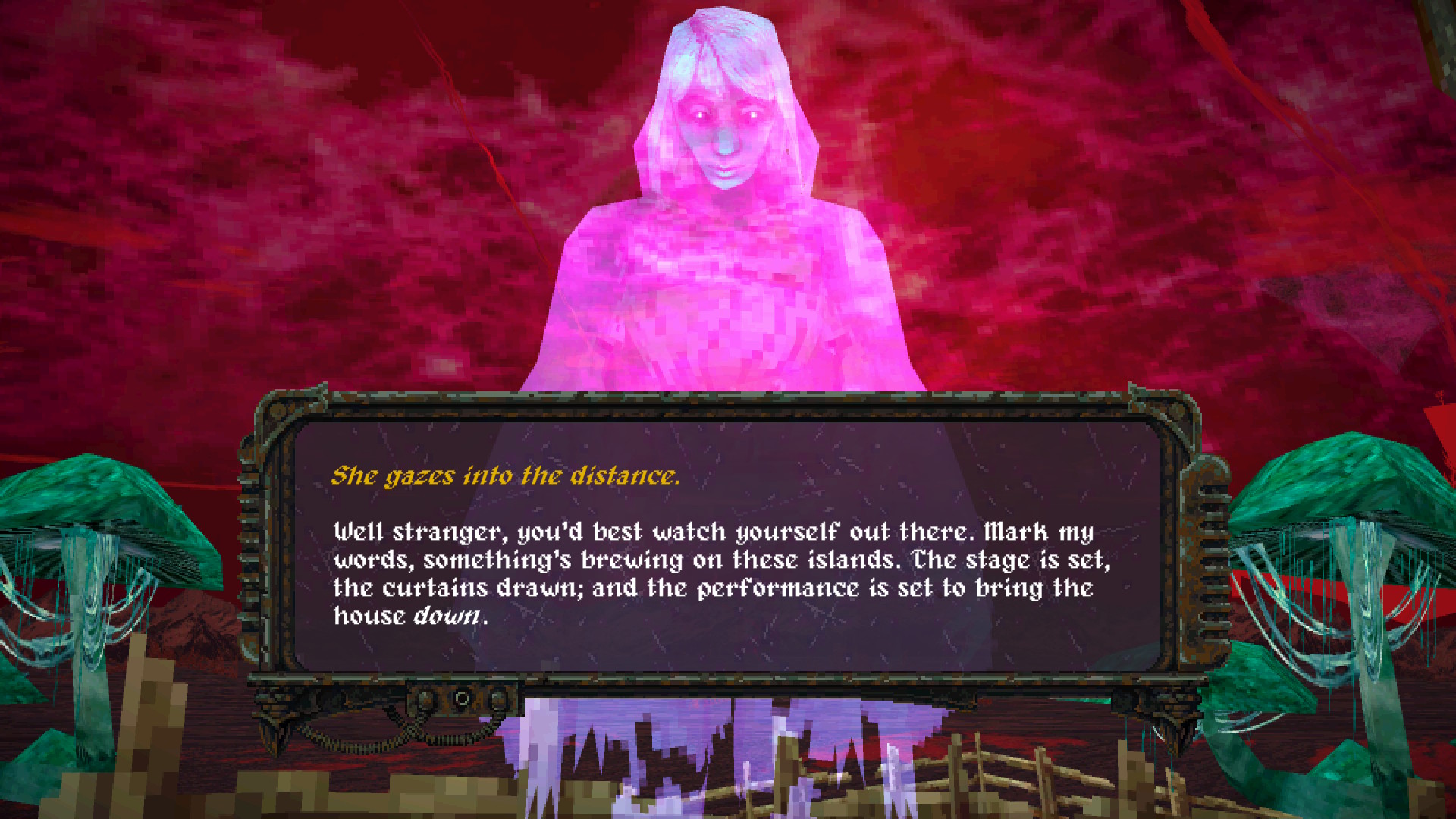 Le monde de Dread Delusion est étrange et inquiétant. Le monde est vaste et il regorge de secrets à découvrir. Dès votre arrivée, vous serez confrontés à l’immensité du paysage et le jeu ne vous prendra pas par la main. Vous pourrez explorer librement et vous serez naturellement attirés vers les points d’intérêts qui sont stratégiquement placés sur la carte. Vous commencerez votre périple dans la première zone, Pwyll, et vous retrouverez rapidement dans le village de Pwyll. Ici, vous rencontrerez les villageois et découvrirez ce qui se trame dans ces terres étranges. Vous serez introduit au thé de Scryshroom et apprendrez pourquoi les récoltes sont de moins en moins fructueuses.