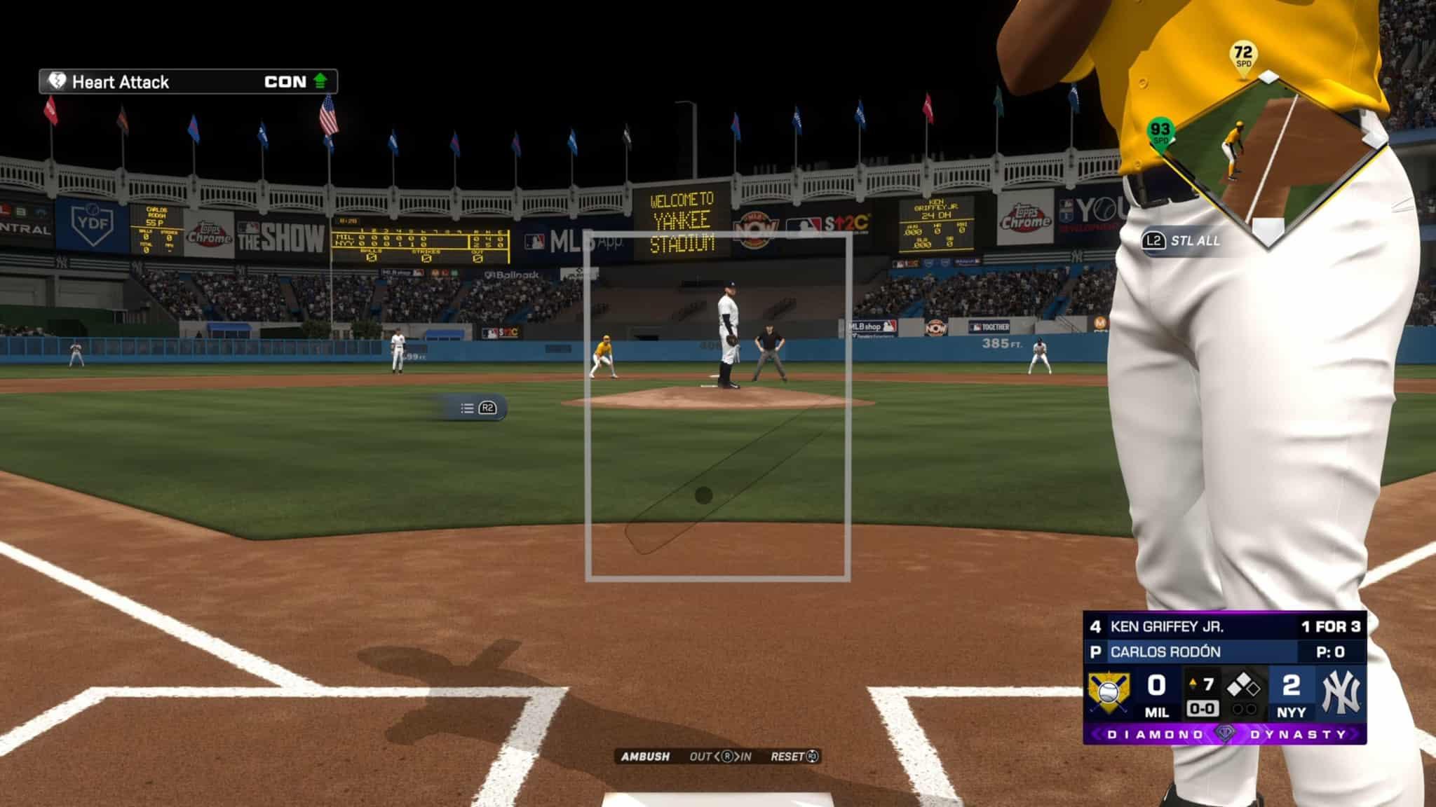 Pour moi, la grande nouveauté cette année est la possibilité de « challenger » la décision d’un arbitre. S’il dit que c’est une prise, mais que vous croyez qu’il a tort, vous appuyez sur la touche indiquée dans votre écran pour que votre joueur se tape la tête. Cela va déclencher une cinématique qui montre l’ABS (la caméra qui voit notre carré et la trajectoire de la balle) et qui va permettre de décider si la décision est bonne ou non. Vous aurez le droit de contester des décisions à deux reprises lors des parties, mais, si la reprise vidéo vous donne raison, vous aurez encore droit à vos deux autres contestations. Encore une fois, c’est un ajout agréable et qui ajoute de l’immersion, mais ce n’est pas suffisant pour dire que The Show 25 et The Show 26 sont réellement différents l’un de l’autre.