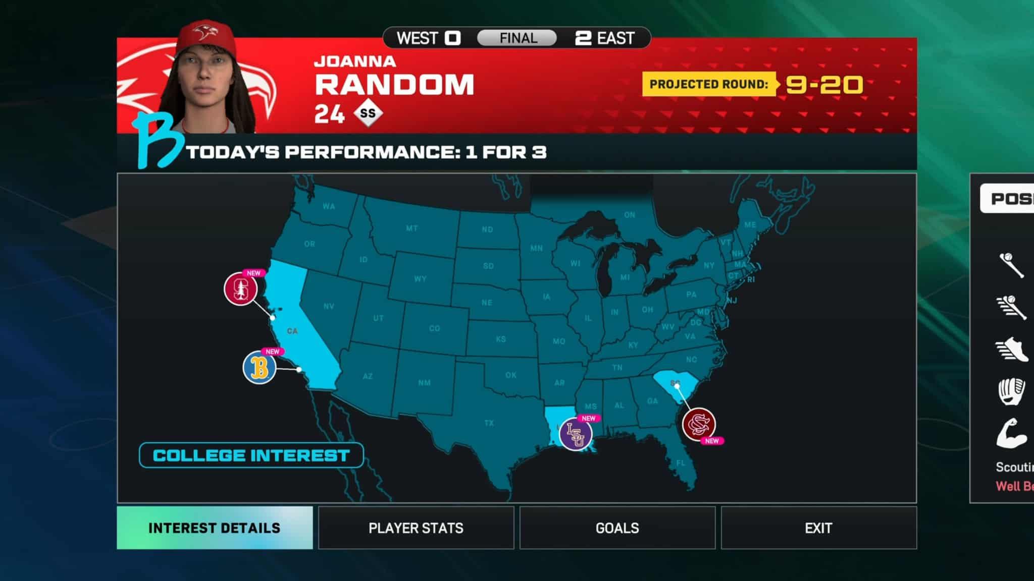 « Road to The Show » est le fameux mode de jeu qui vous permet de devenir une vedette. Si vous n’êtes pas familiers avec la série, « Road to The Show » vous permet de créer votre propre personnage et de le faire évoluer dans le sport. Vous vivrez la carrière complète d’un joueur en incluant les rencontres avec le coach, les dépenses luxueuses, les séances d’entraînement et les relations avec les recruteurs et les équipes. The Show 26, vous donne la possibilité de créer un joueur ou une joueuse, selon votre sexe ou vos préférences, et vous fait commencer dans le bas de l’échelle. Vous débuterez votre carrière en tant qu’élève du secondaire et vous devrez jouer quelques parties pour vous faire connaître par les recruteurs d’autres écoles pour le niveau collégial. Selon vos performances, certaines écoles pourraient être ou ne pas être intéressées par vous. Vous pourrez choisir l’école de votre choix, mais les écoles ont des niveaux que l’on pourrait qualifier comme des difficultés. Pour qu’elles soient intéressées par votre talent, vous devrez en avoir. Si vos performances ont été médiocres lors de vos premiers matchs, il se pourrait que votre choix d’école pour votre carrière collégiale soit limité. Il est aussi important de noter que toutes les écoles donnent des bonus différents. Vous pourriez choisir l’Arizona pour obtenir, par exemple, un bonus de vitesse, ou la Californie pour obtenir un bonus de frappe.