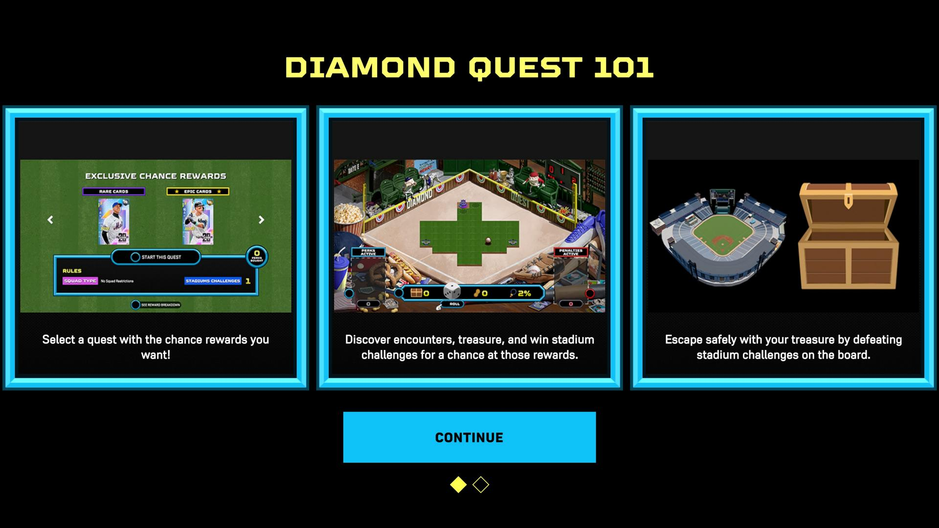 Pour les personnes moins fanatiques, ou simplement pour obtenir plus de cartes pour votre équipe de rêve, il y a toujours le mode « Diamond Quest » est un jeu d’aventure à la sauce roguelike dans lequel vous devrez lancer un dé pour vous déplacer et relever des défis afin de gagner des cartes de joueurs (toutes cartes confondues) et même des terrains ! Ces épreuves peuvent être, par exemple, une réalisation d’un retrait au poste de lanceur ou la réussite d’un coup sûr. Ce sont des tâches courtes suivies d’un match en trois manches qui mettront à l’épreuve votre équipe favorite. C’est une bonne façon d’obtenir plus de cartes, mais c’est aussi un mode de jeu très amusant.