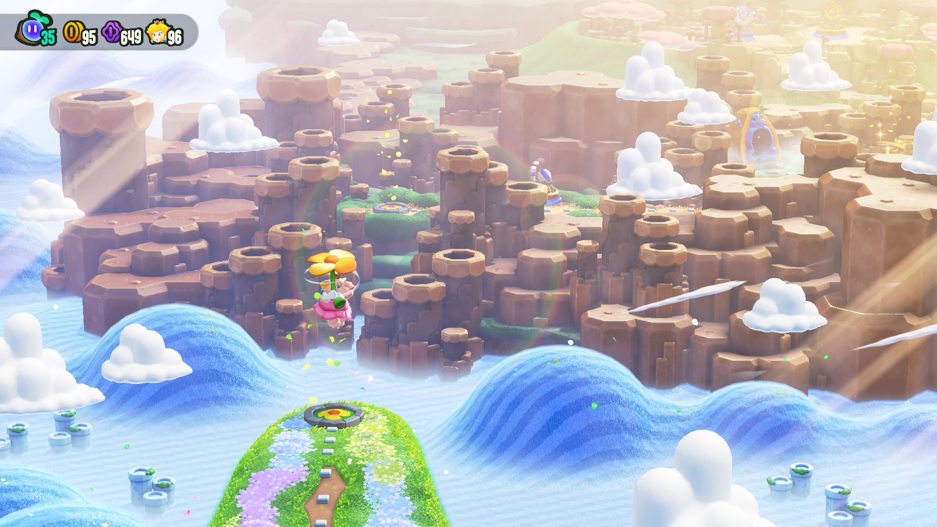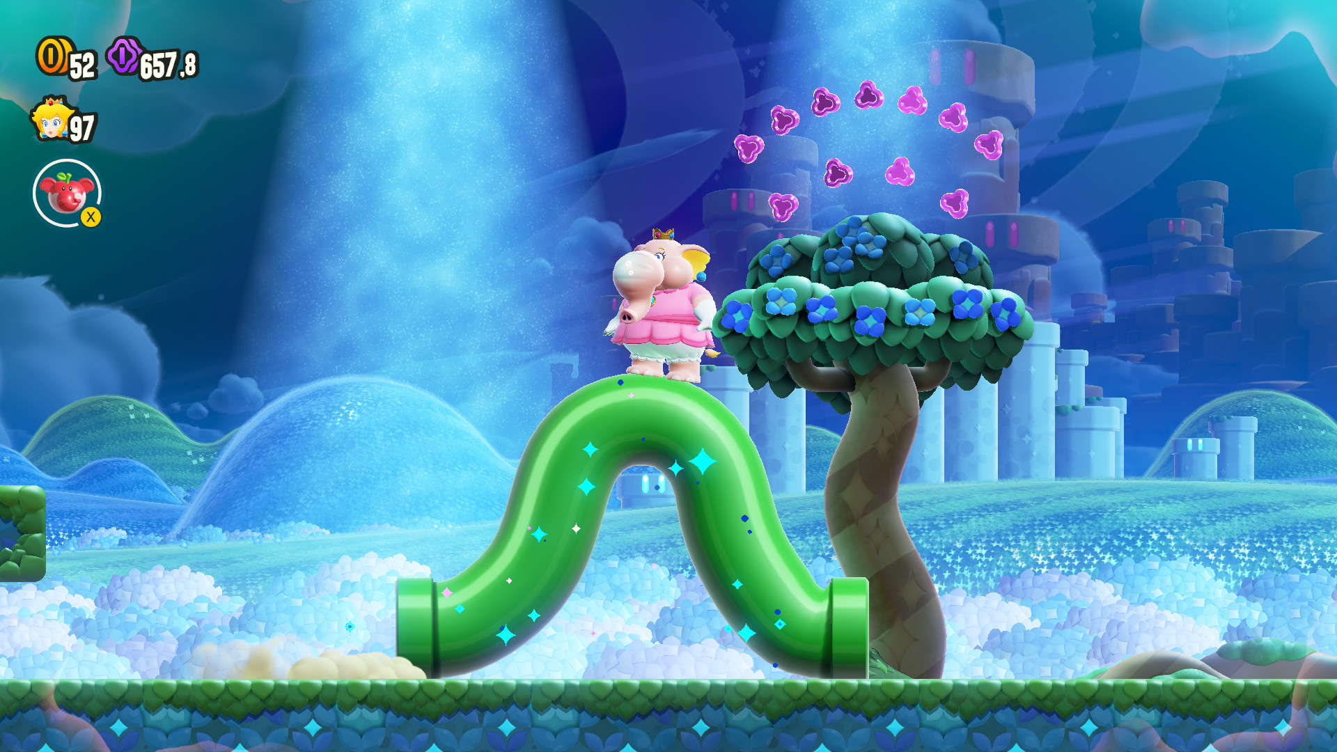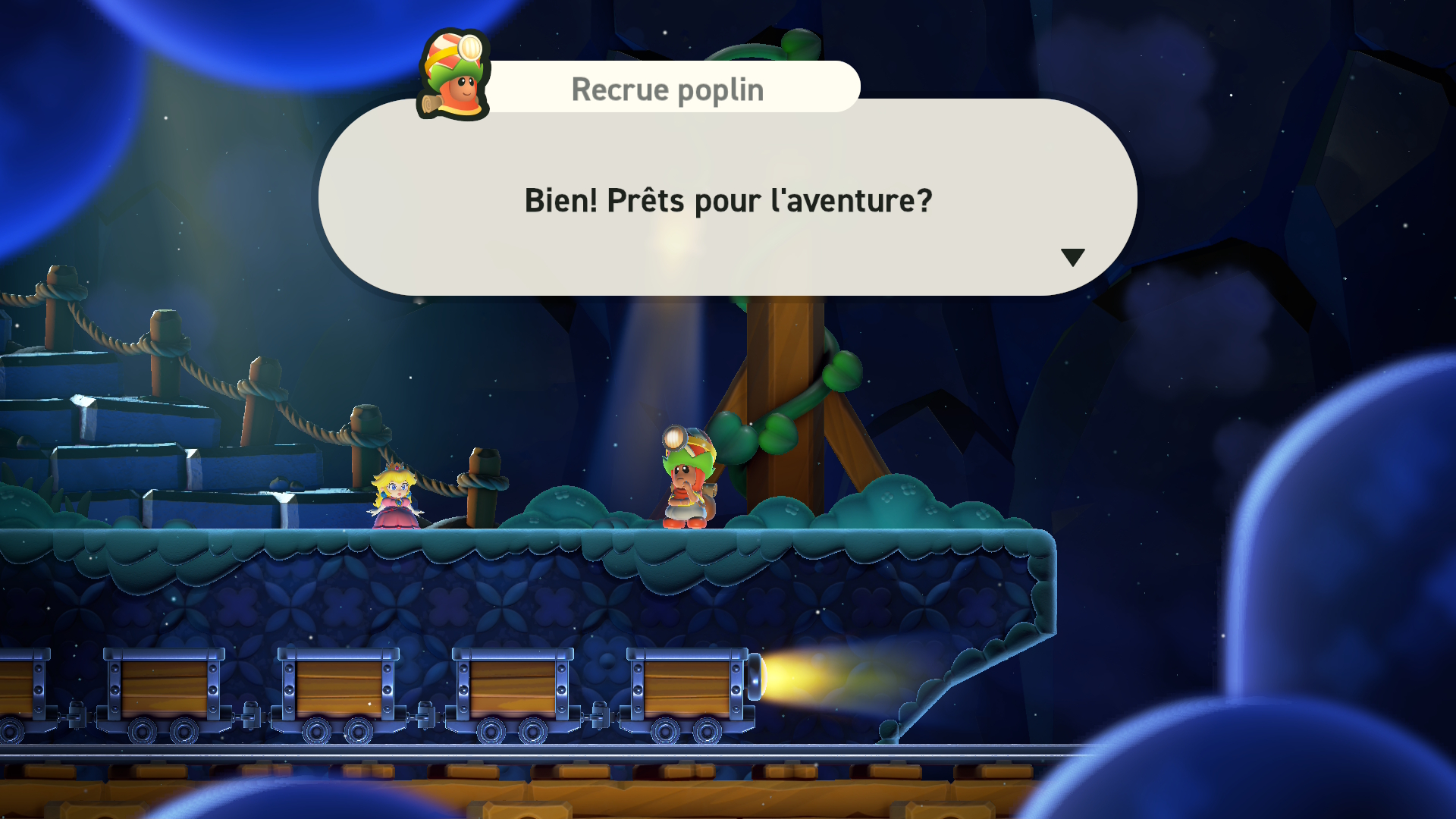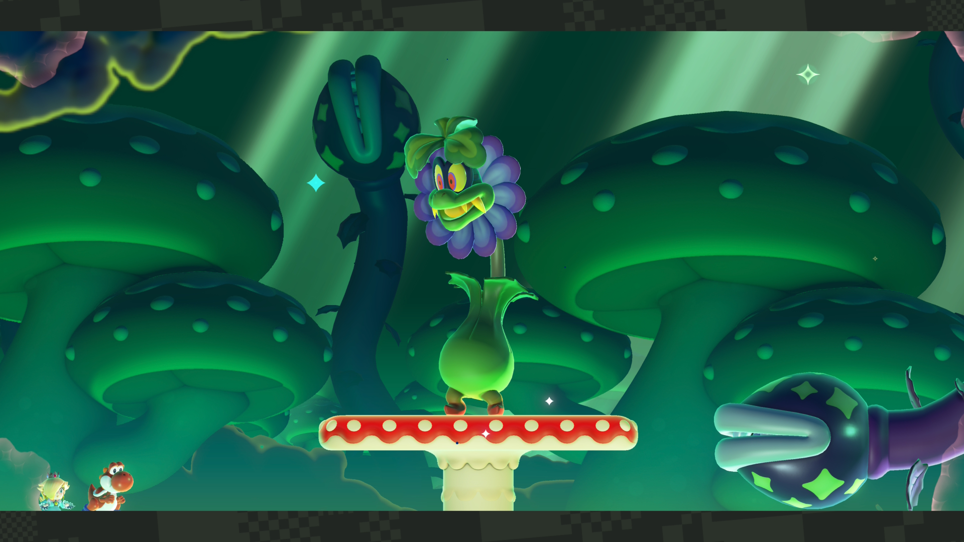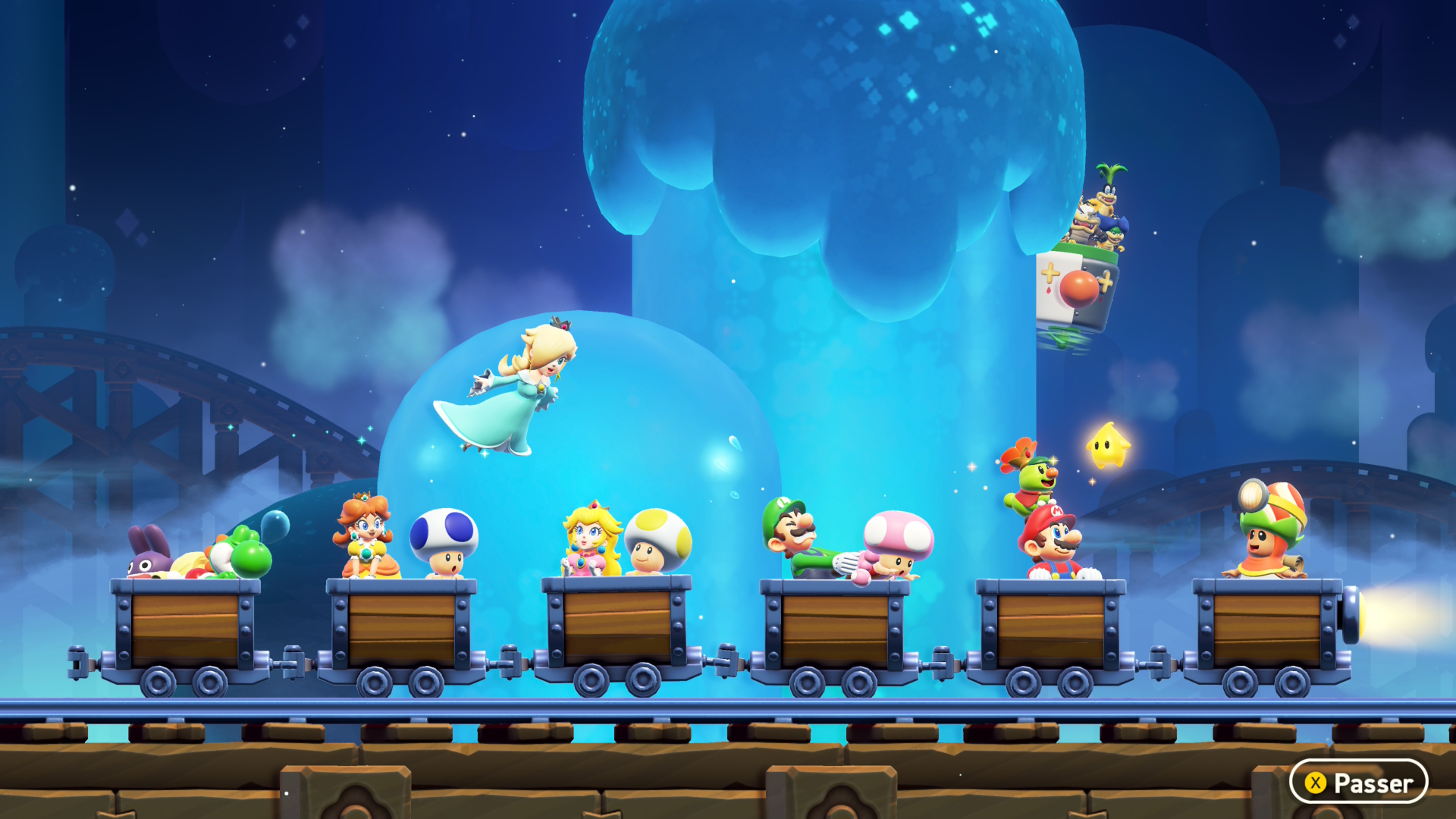 Pour ce qui est des nouveautés proposées dans l’extension, en vous connectant au jeu, vous recevez un « flash spécial » vous disant qu’une entrée vers le parc Bellabel a été découverte dans la « Plaine des tuyaux ». Pas besoin d’avoir terminé beaucoup de niveaux du jeu principal pour y avoir accès, seuls les quatre premiers niveaux seront nécessaires. Pour déverrouiller le terrain, il vous faut trois graines de prodige afin de délivrer la recrue Poplin des griffes de la plante carnivore qui obstruait l’entrée du parc Bellabel. Vous aurez aussi remarqué que Rosalina et Luma, l’étoile, sont maintenant disponibles parmi les personnages que vous pouvez choisir de jouer! Luma sera cependant seulement un personnage allié qu’il sera possible d’utiliser seulement quand vous serez plus de deux joueurs. Luma ne subira aucun dégât, mais elle pourra combattre des ennemis et amassez des pièces. Vous pouvez aussi jouer ce personnage avec le mode souris. Je trouve que c’est un très bel ajout. Sinon, il y a aussi un nouveau pouvoir qui vous permet de vous transformer en fleur, lancent des fleurs ascendantes et des lianes pour vous accrocher. Rosalina, Luma et le nouveau pouvoir peuvent tous être utilisés pour compléter l’entièreté des niveaux du jeu.