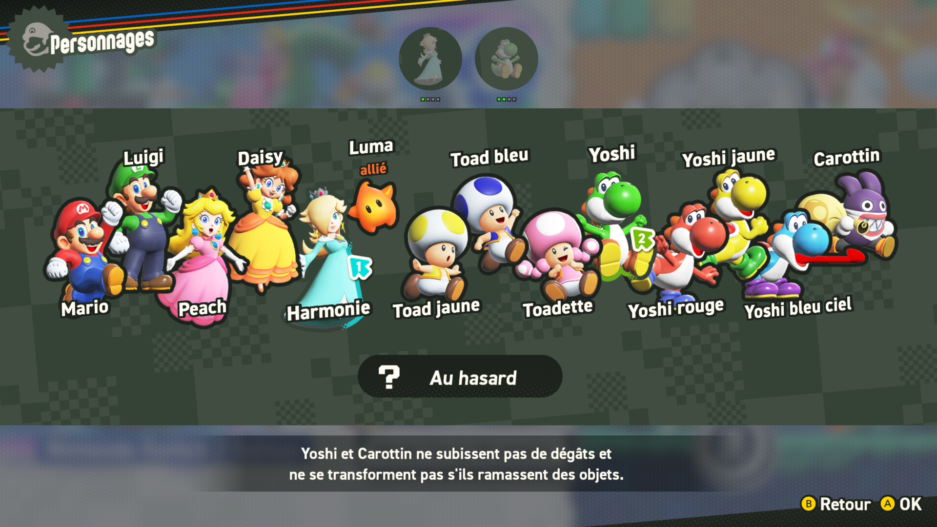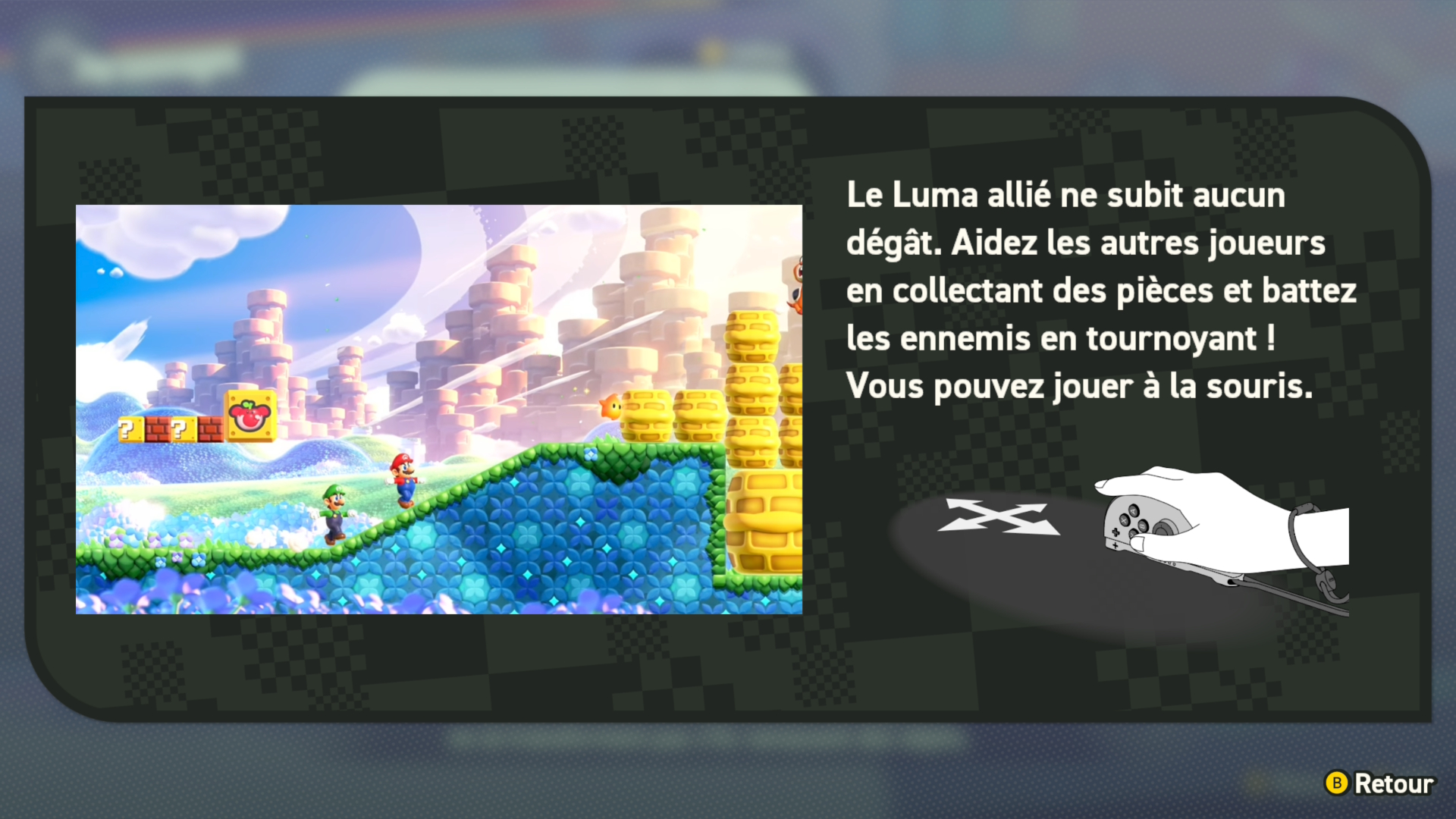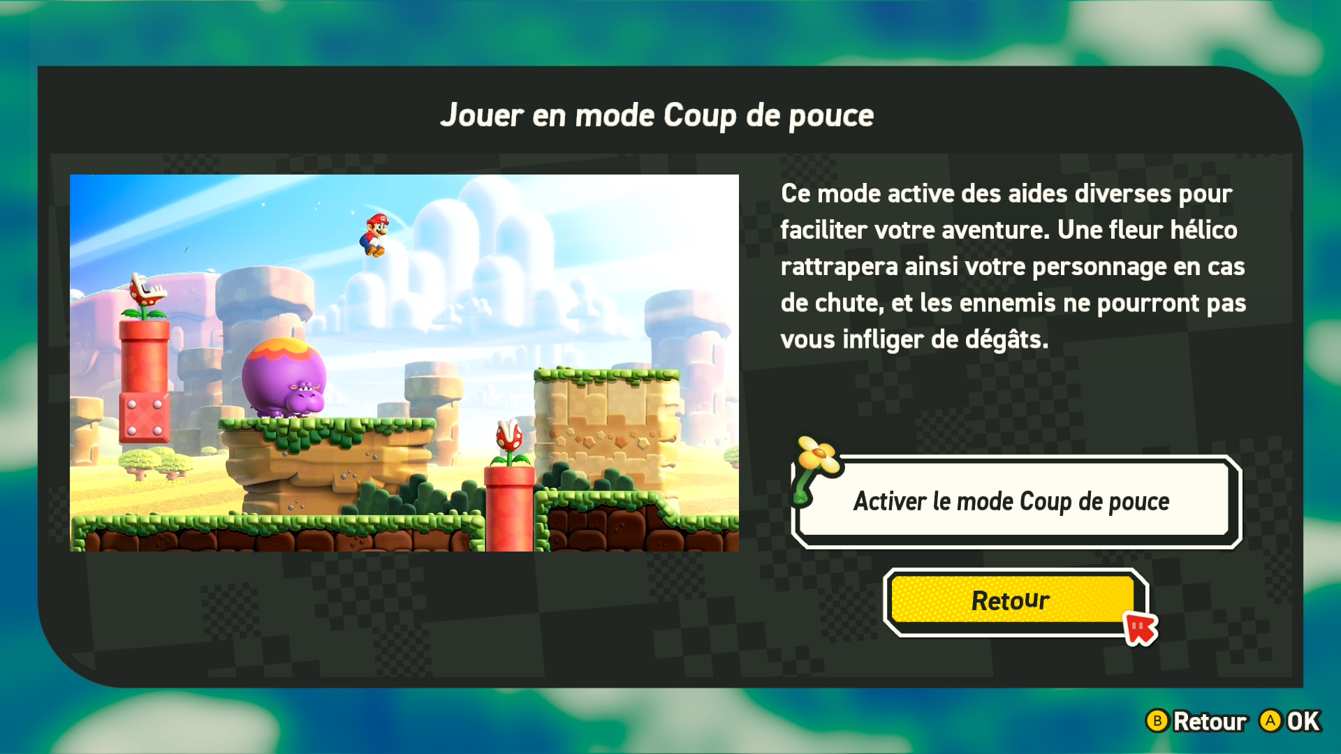 Un autre ajout est le mode coup de pouce qui rend le jeu encore plus facile pour les tout petits. Avant, il n’y avait que les Yoshis et Carottin qui ne prenaient pas de dégât. Maintenant, grâce à ce mode de jeu, votre enfant pourra incarner n’importe quel personnage et bénéficier de ces avantages. En plus de ne pas subir de dégât, les chutes fatales seront de l’histoire ancienne, car une « fleur hélico » les rattrapera en cas de chute et les rendra invincibles.