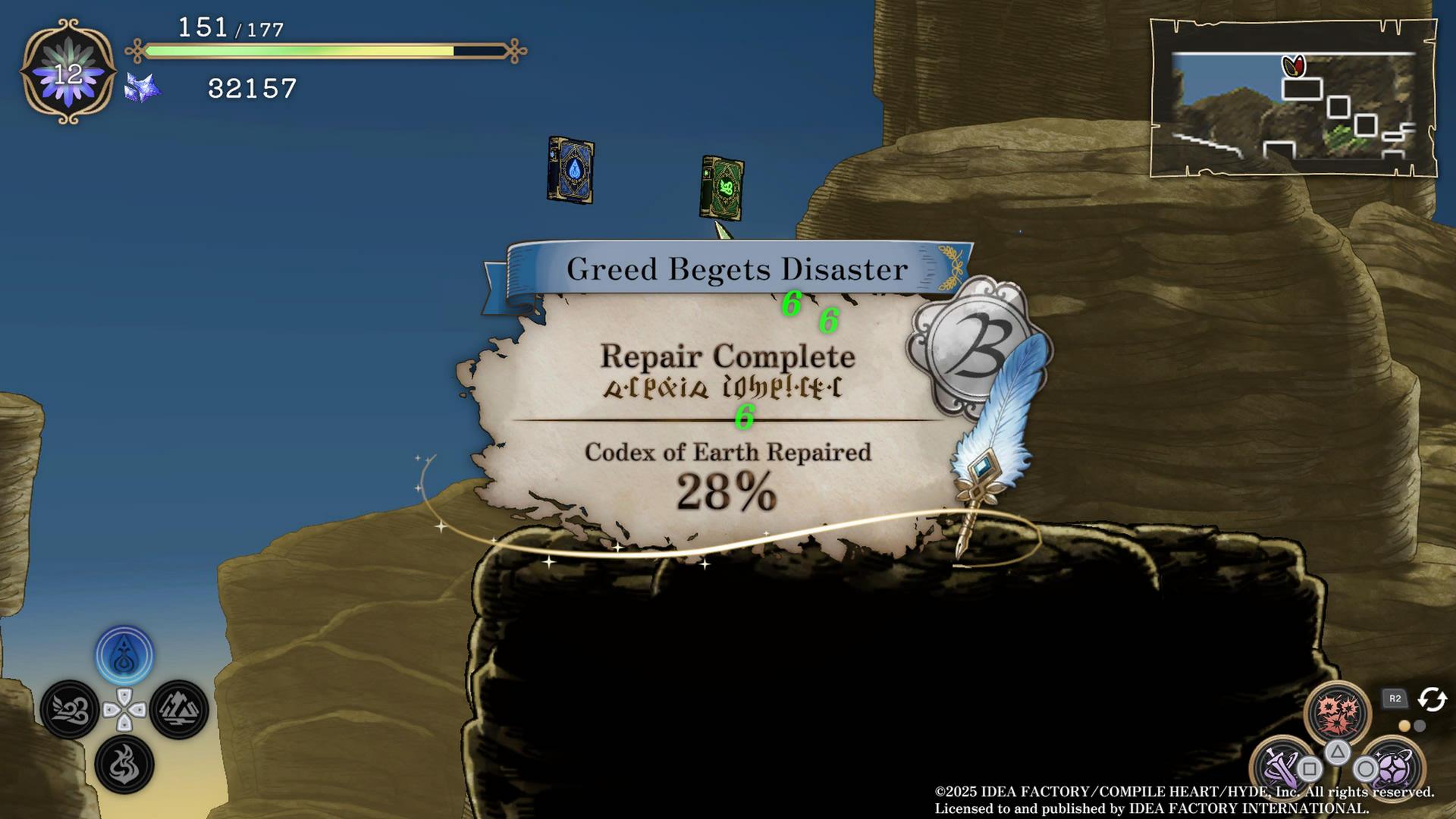 L’échec n’est pas trop punitif, car vous pourrez retenter le défi immédiatement. Je vous le dis tout de suite, il n’est pas possible de réparer totalement un Codex sans avoir vaincu les mini boss des autres tomes pour acquérir certaines habiletés nécessaires à leur réparation complète (nous y reviendrons). Sur la carte, il sera aussi possible de voir les points de repère importants, comme les points altérés ou bien les zones de repos qui vous permettront de sauvegarder votre partie. Outre cela, il est possible qu’il y ait des passages secrets, donc, lorsque vous explorez, je vous conseille de vérifier les murs, vous y découvrirez parfois des coffres aux trésors contenant des choses utiles.