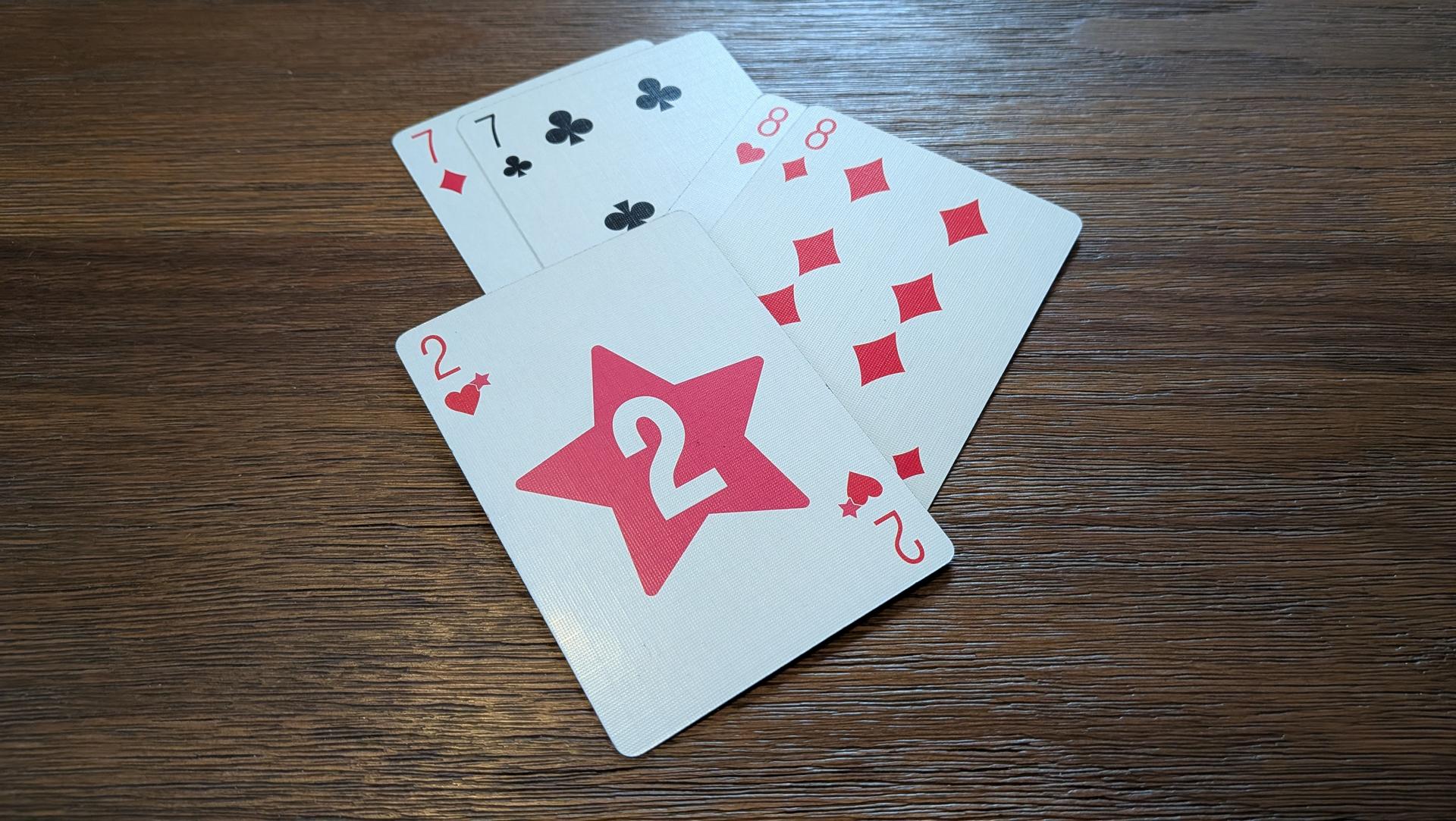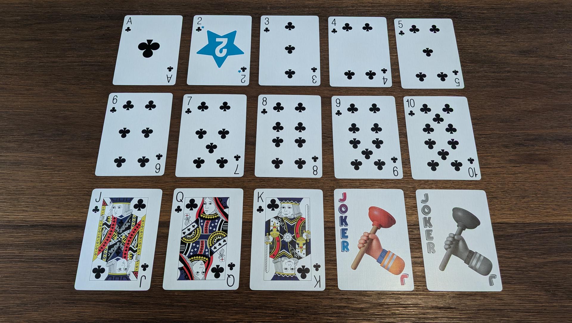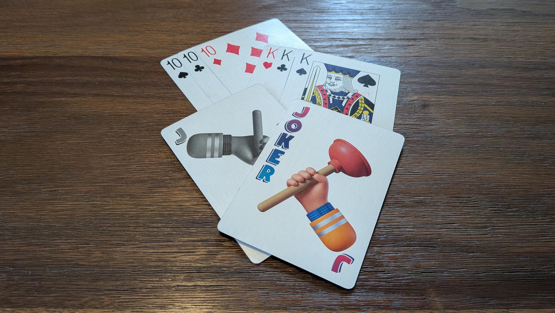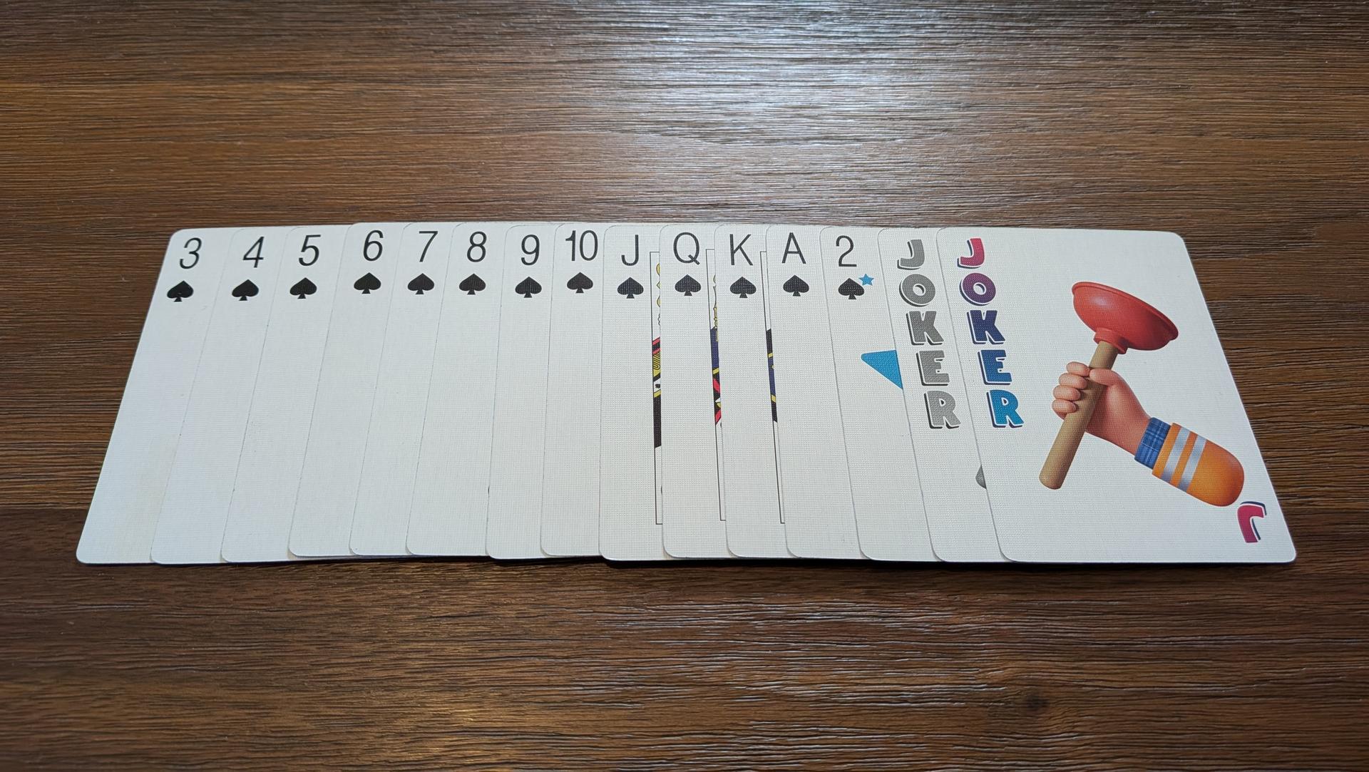 Globalement, le jeu m’a beaucoup plu. Par contre, je dois admettre que j’ai été légèrement déçu par le design des cartes. Comme vous avez pu le voir dans les images, les cartes sont très classiques à l’exception des « 2 » qui sont entourés d’une étoile pour indiquer qu’il s’agit d’une frime et les jokers qui représentent un siphon à toilette. Certes, c’est une touche de créativité, mais j’aurais aimé que le jeu soit encore plus unique. Surtout lorsque l’on prend en considération que les suites n’ont aucun impact dans le jeu, l’opportunité de faire quelque chose de plus thématique avec les suites aurait pu être saisie. Nous avons eu toute la même réaction en déballant le paquet. Ce n’est certainement pas dramatique, mais j’aurais aimé que le design me décroche un sourire.