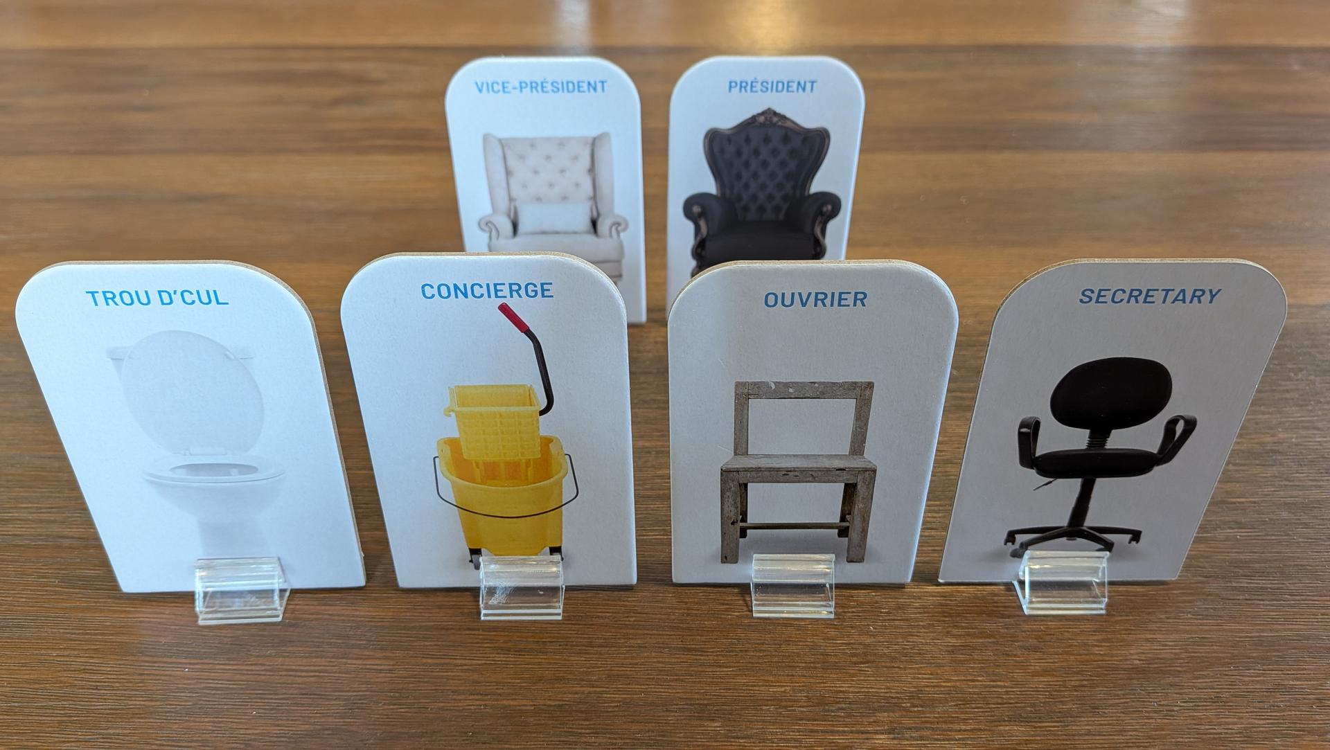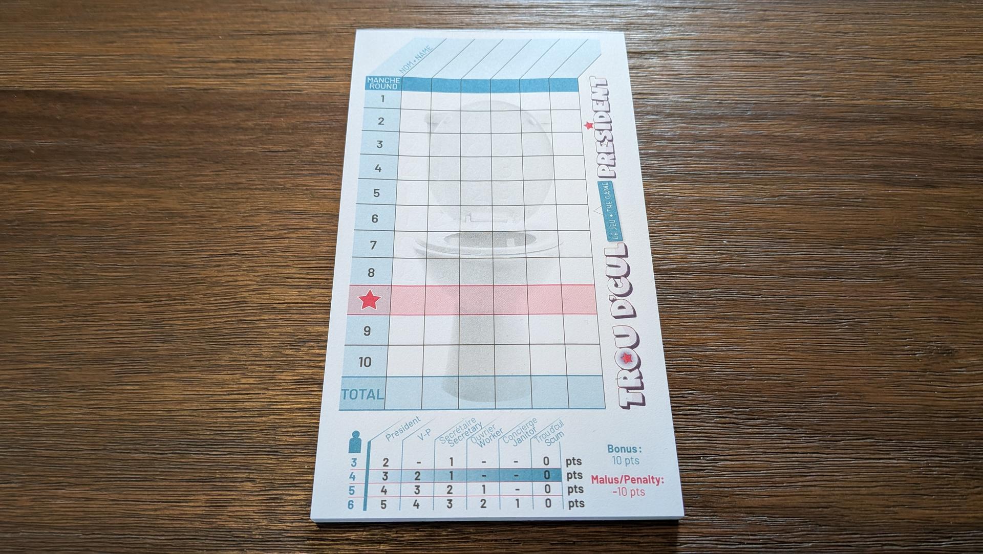Ce qui est le plus intéressant avec cette version du jeu est qu’un système de pointage a été implanté. Généralement, les gens y jouaient jusqu’à ce que quelques joueurs quittent et que la partie se termine naturellement, mais il était très difficile de déterminer un vrai gagnant. Maintenant, vous pourrez connaître le vrai gagnant en vous fiant au pointage. Vous ferez huit rondes et les points seront comptés après chacune d’elles. Par exemple, lors d’une partie à quatre joueurs. Celui qui termine la ronde sur la chaise du président mérite trois points de victoire, le secrétaire marque deux points, le concierge seulement un et le trou-de-cul zéro. Toutefois, si le trou-de-cul monte directement au rang de président, il gagne dix points et si l’inverse se produit, c’est-à-dire si le président passe directement au rang de trou-de-cul, il perd dix points! Nous avons adoré la façon dont le pointage fonctionne et l’attribution des points est juste. Un joueur qui, après cinq rondes à occuper le siège de président, passe au rang de trou-de-cul à la fin du sixième tour voit son pointage passer de 15 à 5. Ça fait mal! Et inversement, un joueur qui, après cinq rondes à occuper le siège du trou-de-cul, passe au rang de président à la fin du sixième tour voit son pointage passer de 0 à 10, ce qui lui donne une vraie chance de gagner!