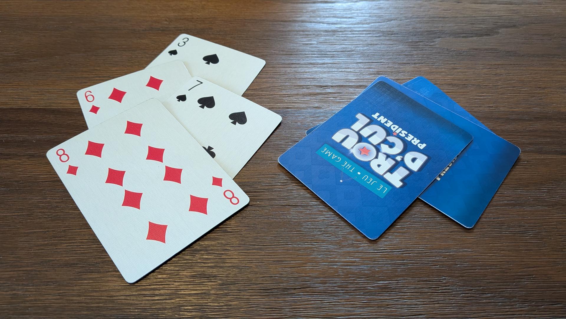 Une des plus belles qualités de ce jeu est qu’il est facile à apprendre. En fait, de tous les jeux de cartes populaires, à l’exception de la bataille, c’est probablement le plus simple de tous. C’est un jeu de défausse hiérarchique, ce qui veut dire que, si le joueur qui vous précède joue une paire de trois, vous devrez jouer une paire de valeurs supérieures. Le Trou d’Cul se joue idéalement avec quatre, cinq ou six joueurs. Bien que la boite mentionne qu’il soit possible d’y jouer à trois joueurs, je ne vous le recommande pas. En début de partie, les cartes seront étalées face cachée au centre de la table et tous les joueurs en choisiront ensuite une. Celui qui pige la carte avec la valeur la plus élevée sera le président et celui qui pige la carte la plus basse sera le trou-de-cul. Il faut savoir que, ici, l’as est plus fort que le roi, mais que le « 2 » est plus fort que l’as. Les valeurs les plus élevées sont donc, dans l’ordre, le joker de couleur, le joker noir et blanc, le deux, l’as, le roi, la reine, etc.