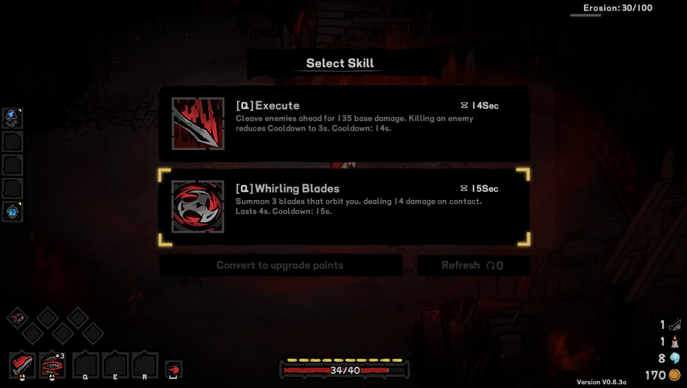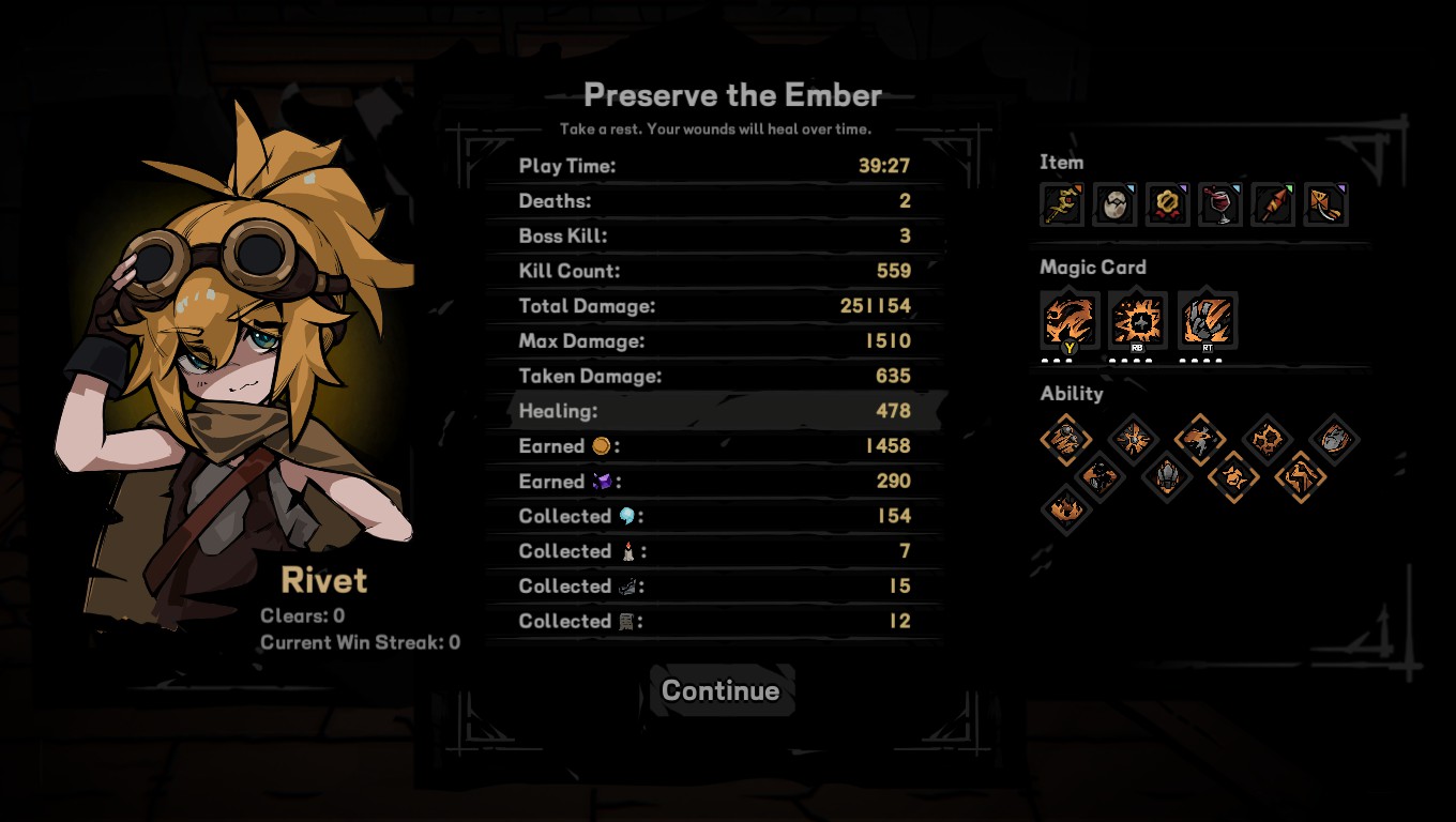 Là où Cinderia devient réellement intéressant, c’est dans sa structure de gameplay. Le titre repose sur un système de fusion entre différentes braises et des cartes de compétence, ce qui permet de transformer ses attaques, de modifier leurs propriétés et d’orienter une « run » vers un style de jeu beaucoup plus spécialisé qu’on pourrait l’imaginer au départ. Très vite, on comprend que le jeu ne veut pas seulement nous bombarder de bonus statistiques. Il veut nous faire construire une manière de jouer.