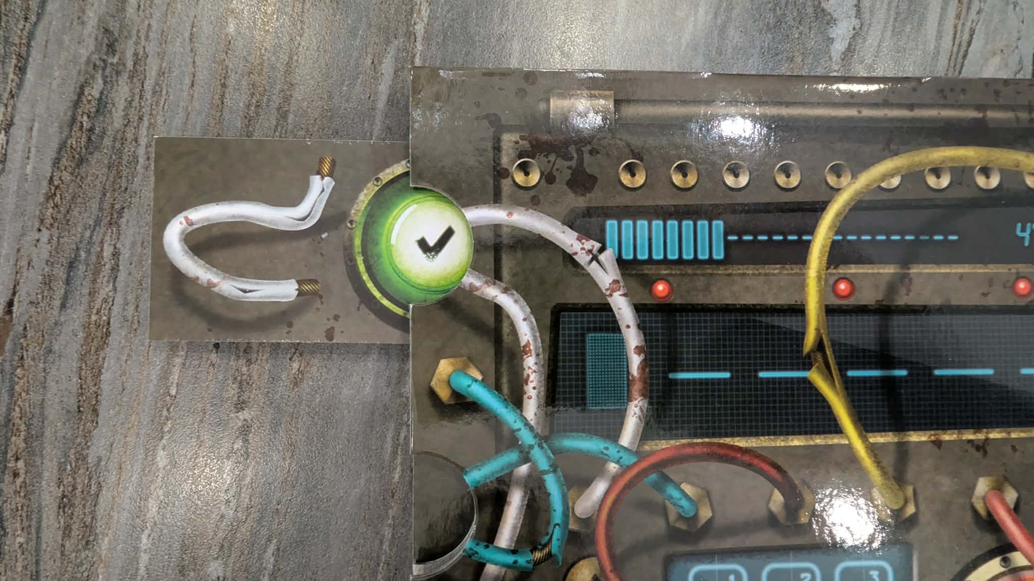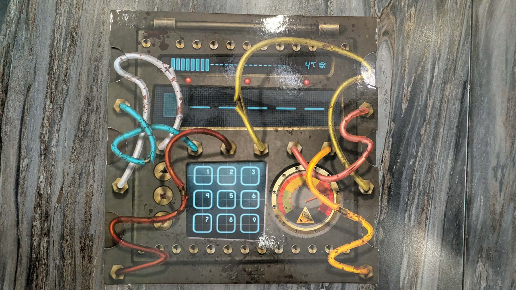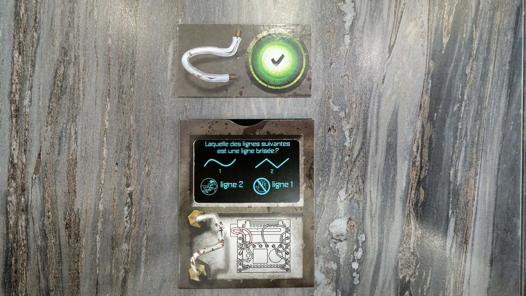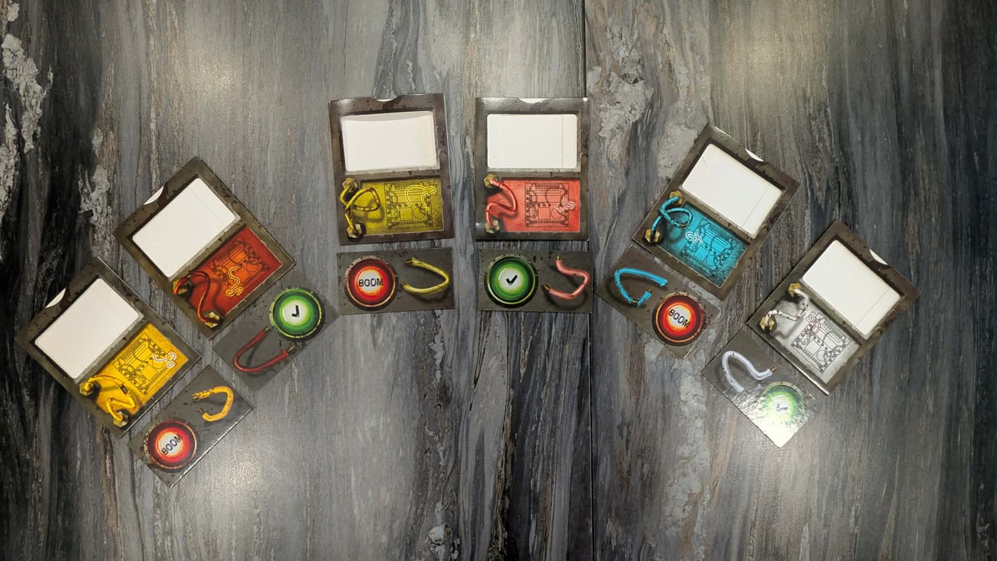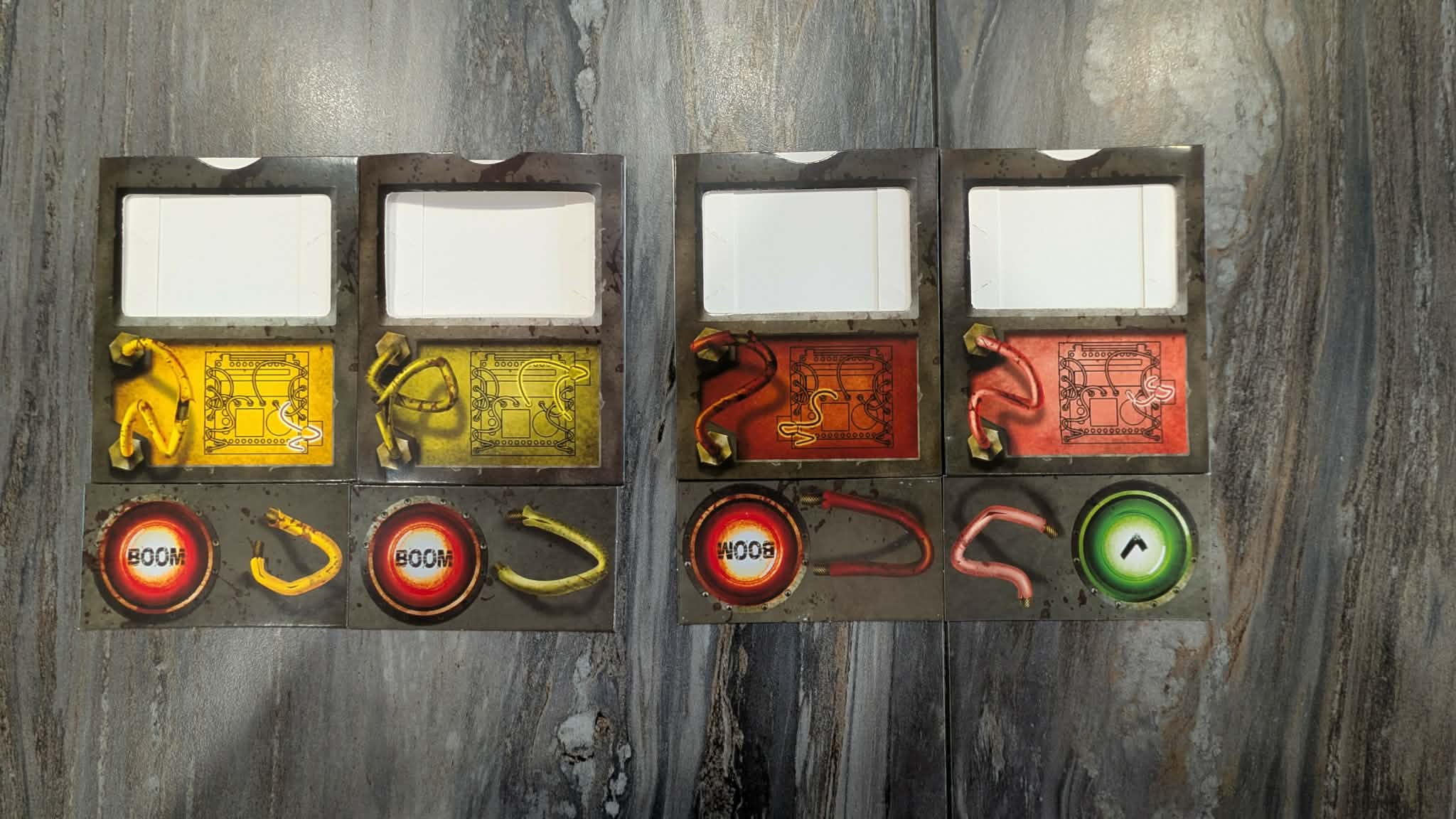 Le matériel est également d’excellente qualité. Je pense notamment au plateau pliable représentant la bombe / coffre-fort et à ses plaquettes représentant les fils de couleur. Les fentes permettant l’insertion des différents fils sont parfaitement adaptées, offrant ainsi une belle fluidité pour insérer et retirer les fils. Cependant, une chose que je trouve dommage est le fait que certaines couleurs de fils se ressemblent beaucoup trop, augmentant ainsi les probabilités d’erreurs, que ce soit lors de la mise en place ou lors de la manipulation en cours de partie. Les pochettes sont également de bonne qualité et s’adaptent parfaitement aux cartes. En parlant de ces dernières, j’aurais peut-être opté pour des cartes un peu plus épaisses afin d’assurer une meilleure durabilité lors de leur insertion dans les pochettes.
