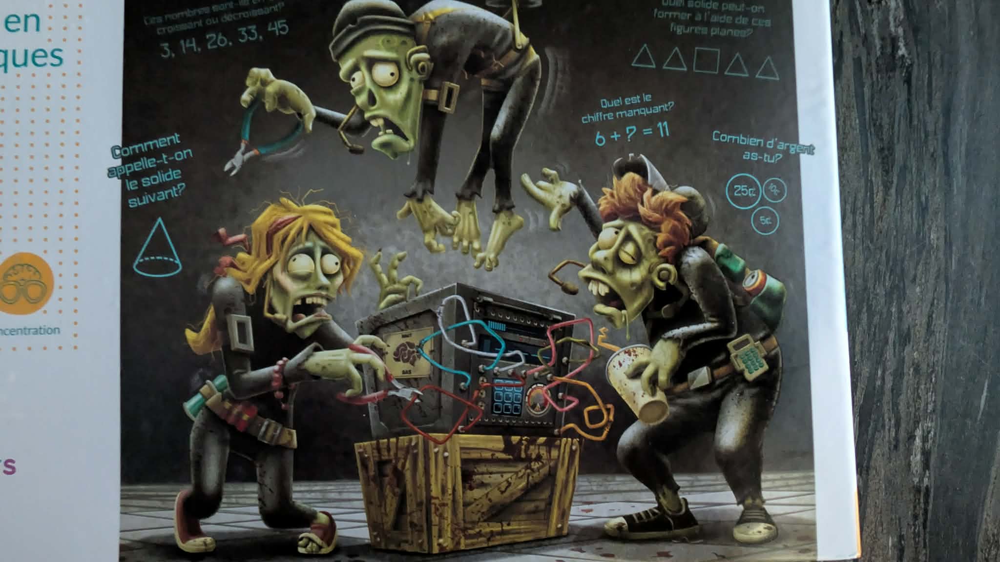 Cette thématique, expliquée comme ça, peut vite paraître un peu extrême et inadéquate pour des enfants de 7 ans. Toutefois, rassurez-vous, le thème est amené d’une manière très saine et amusante, et est du même coup dédramatisé grâce à de belles illustrations et à une mécanique de jeu qui fait en sorte que les enfants oublient rapidement la thématique. L’enfant, qui joue son rôle de zombie, doit répondre à six questions mathématiques. Chaque question est liée à une couleur de fil présente sur le coffre-fort. La réponse de chaque énigme va indiquer à l’enfant si un fil doit être coupé ou non pour que le coffre-fort soit ouvert en toute sécurité… ou qu’il explose, réduisant ainsi à zéro tout espoir de gagner la partie.