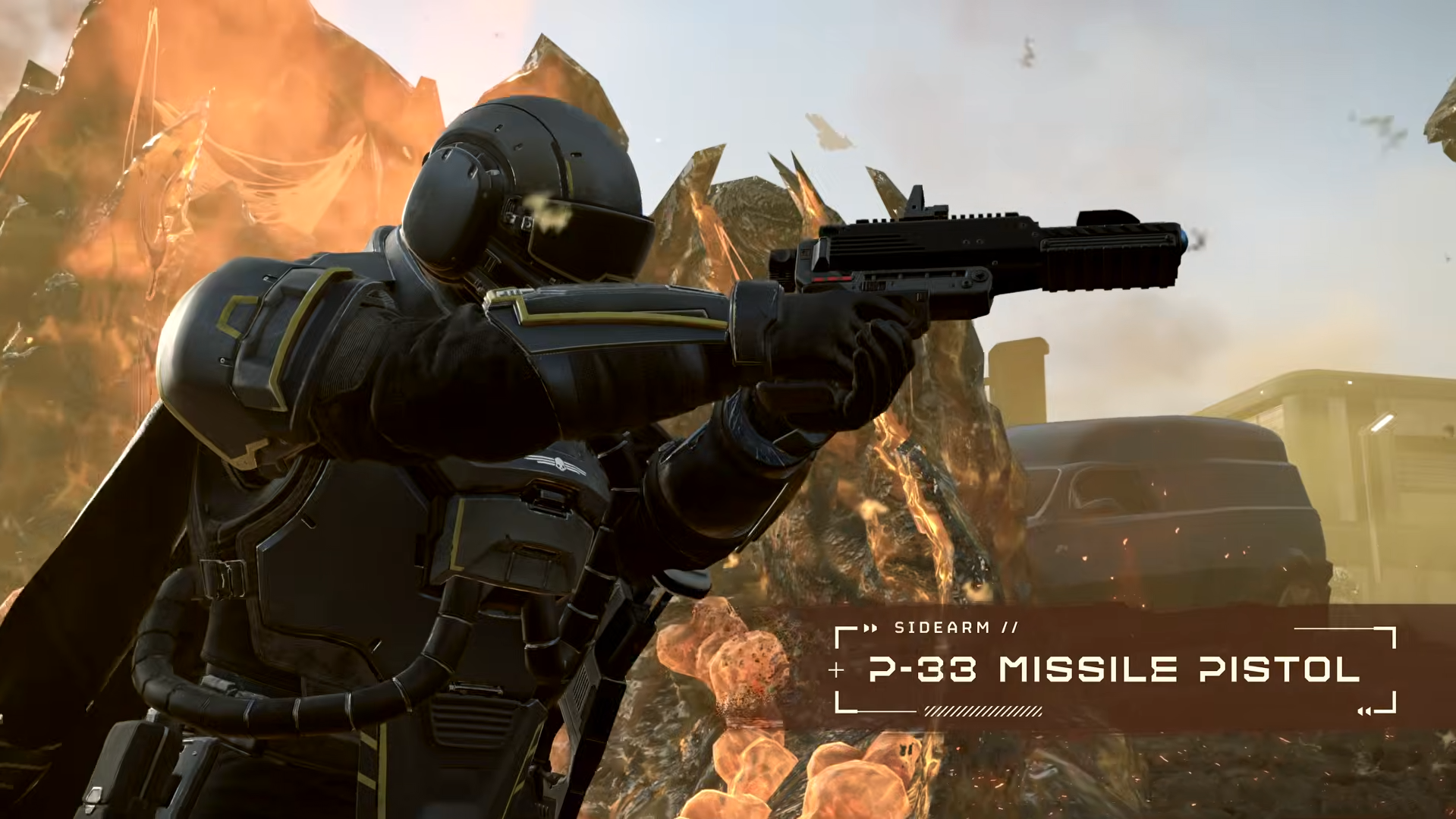 · P‑33 Missile Pistol – Arme de poing à missiles guidés, dotée d’un système de verrouillage de cible.