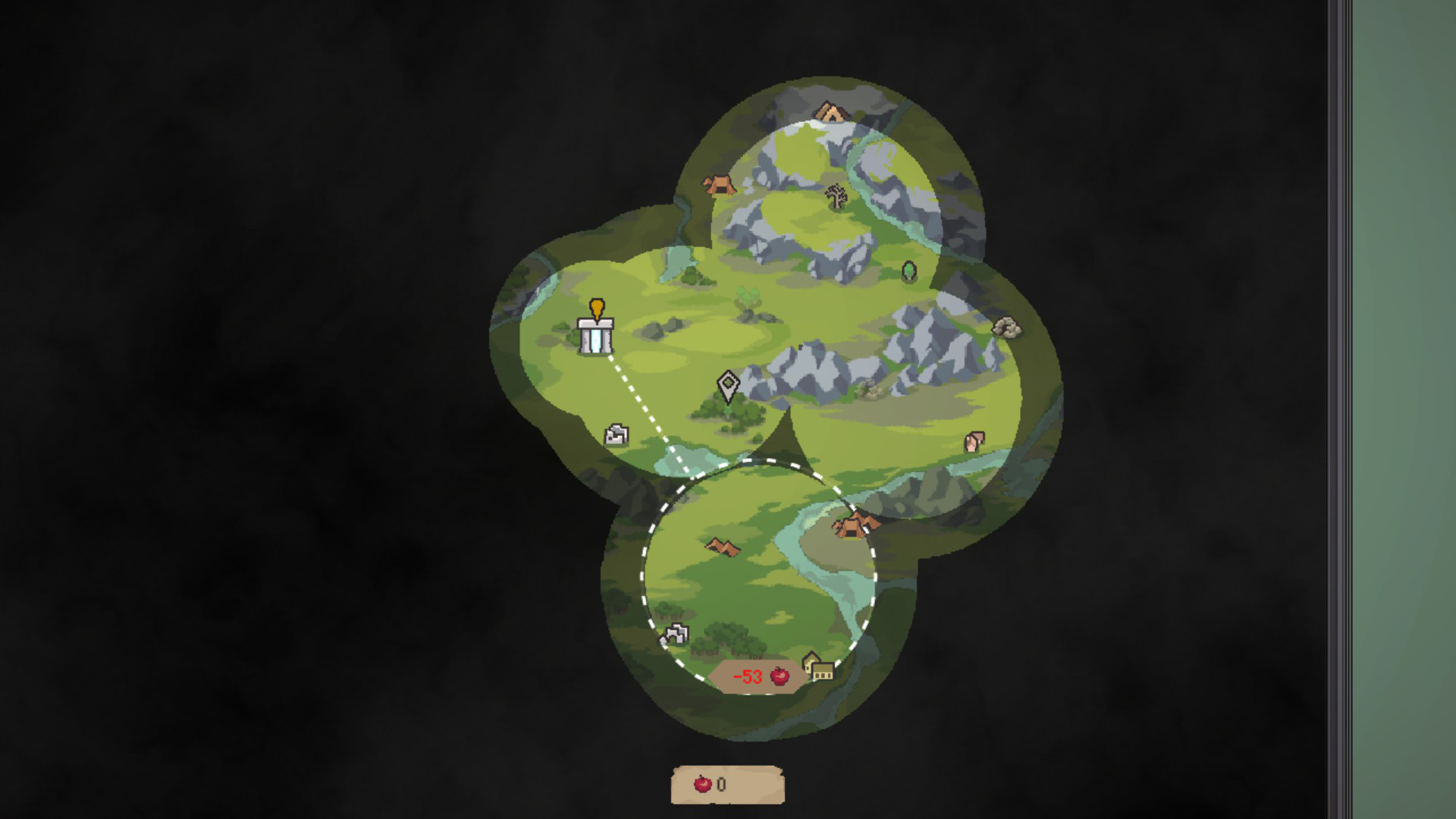 Lorsque vous quitterez votre colonie en empruntant le portail magique, vous vous retrouverez dans différentes zones que vous devrez explorer. La première zone, Otam, est plutôt vaste et regorge de secrets. Vous risquez de passer quelques heures seulement à explorer cet endroit. Une autre chose qui est unique à propos de Regions of Ruin: Runegate est la façon dont vous explorerez la carte. Pour découvrir de nouveaux lieux, vous devrez choisir un endroit dans la carte et appuyer pour dévoiler un cercle. Plus cet endroit est éloigné du portail, plus vous devrez dépenser de vivres pour le découvrir. Une fois l’endroit découvert, des lieux d’intérêt se dévoileront et vous pourrez voyager entre chacun d’eux gratuitement.
