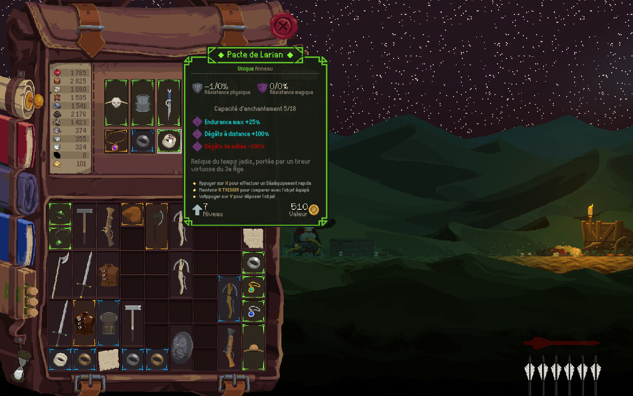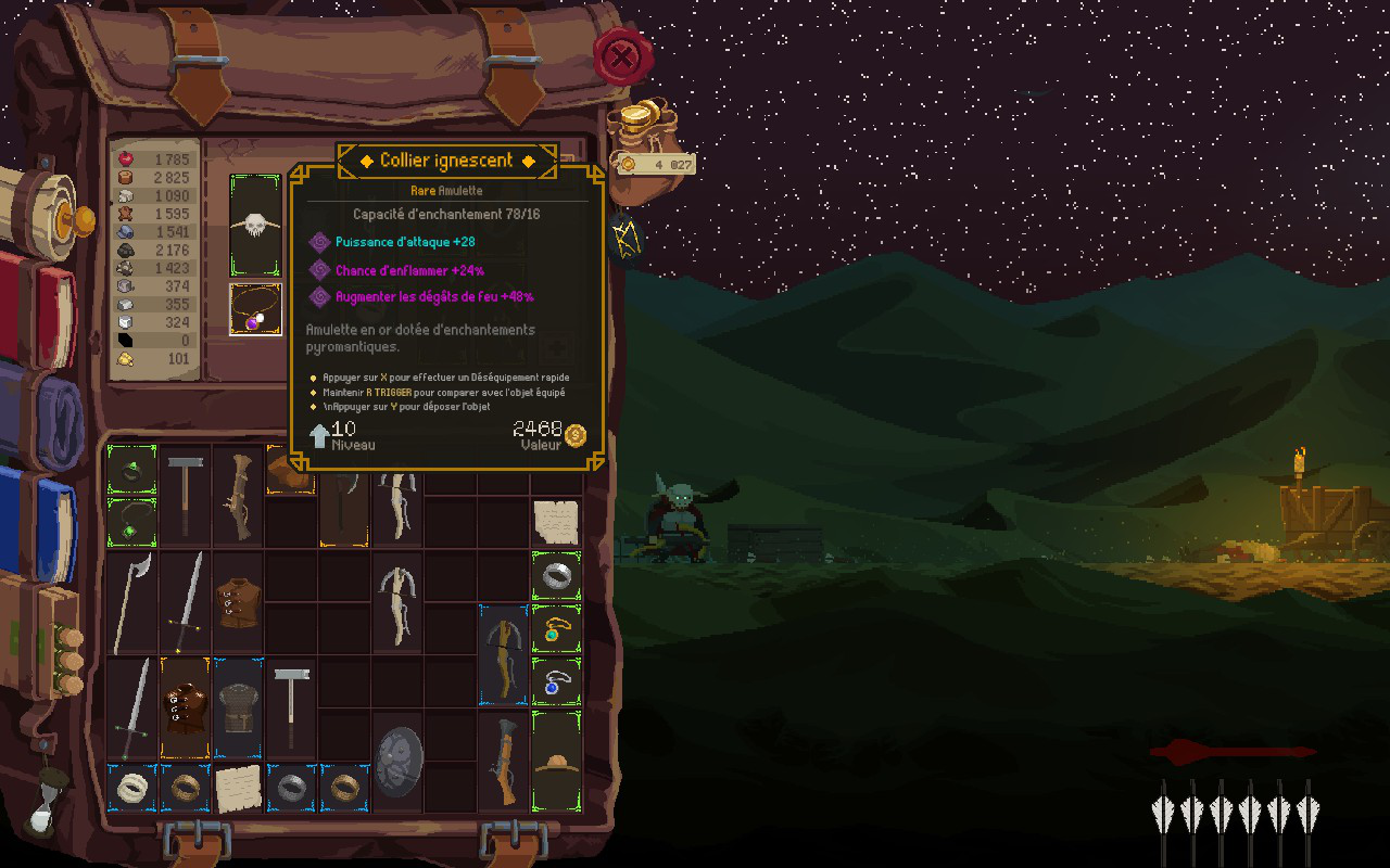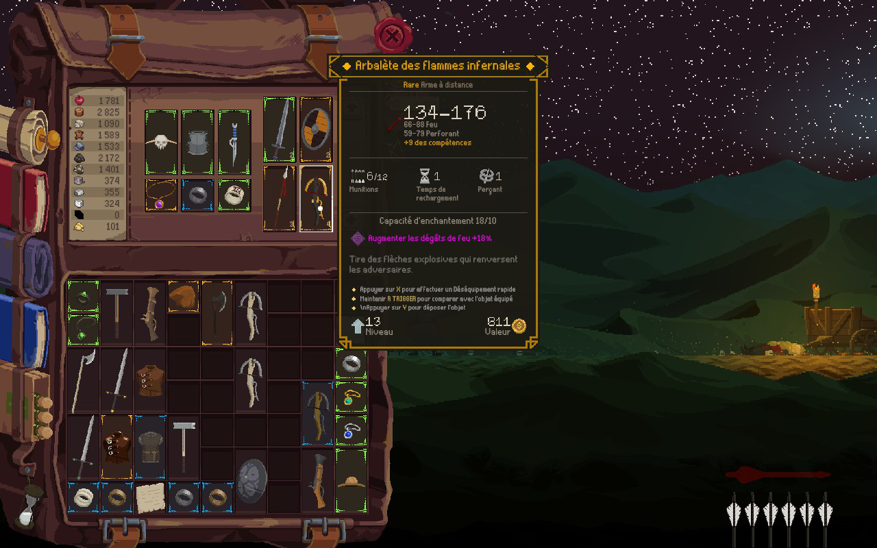 En ce qui concerne les choix d’équipement, Runegate est généreux. Une tonne d’objets s’offrent à vous avec différents niveaux de rareté et des modificateurs variés. Pour vous donner quelques exemples, voici ce qui rendait les armes à distance si attrayantes pour moi. Premièrement, j’ai mis la main sur un anneau qui double mes dégâts à distance. Lorsque je l’ai jumelé avec un collier qui augmente mes dégâts de feu et avec une arbalète qui tire des carreaux explosifs et qui enflamme les ennemis, j’ai créé une combinaison très puissante. Cette combinaison est aussi létale qu’amusante, mais elle peut parfois être trop forte pour la ligue. J’ai parfois eu l’impression de briser le jeu tellement j’étais fort, mais j’ai pris un plaisir fou à décimer mes ennemis.