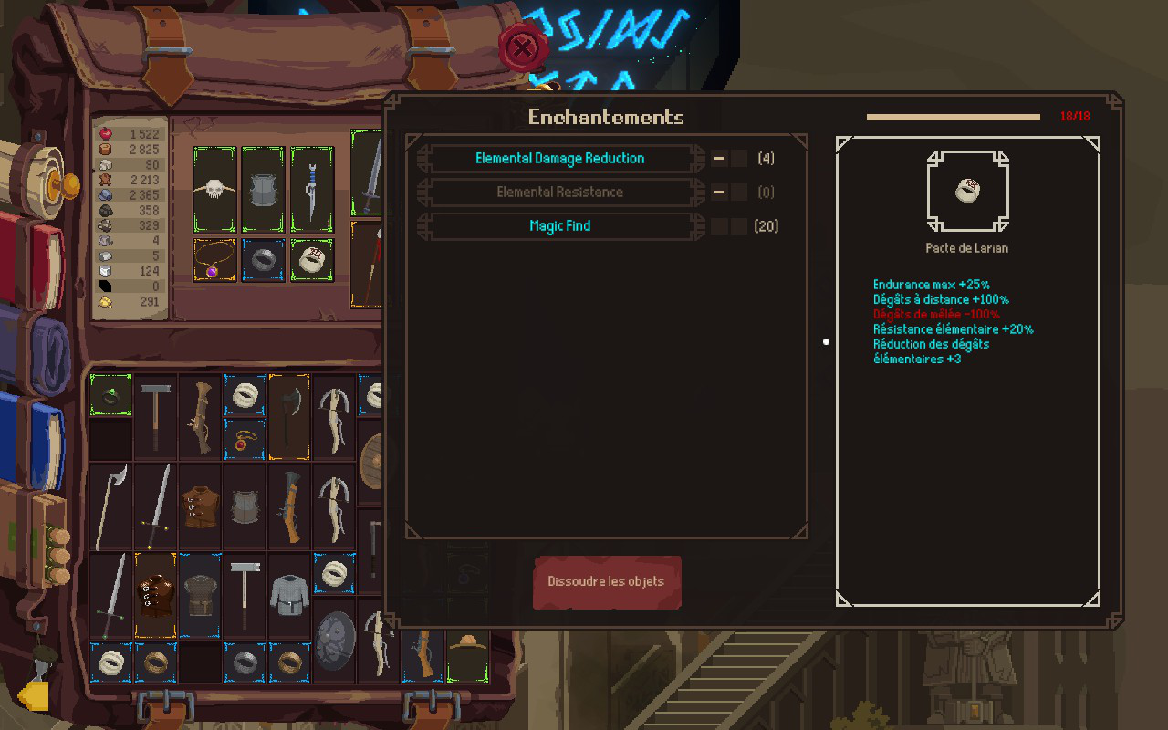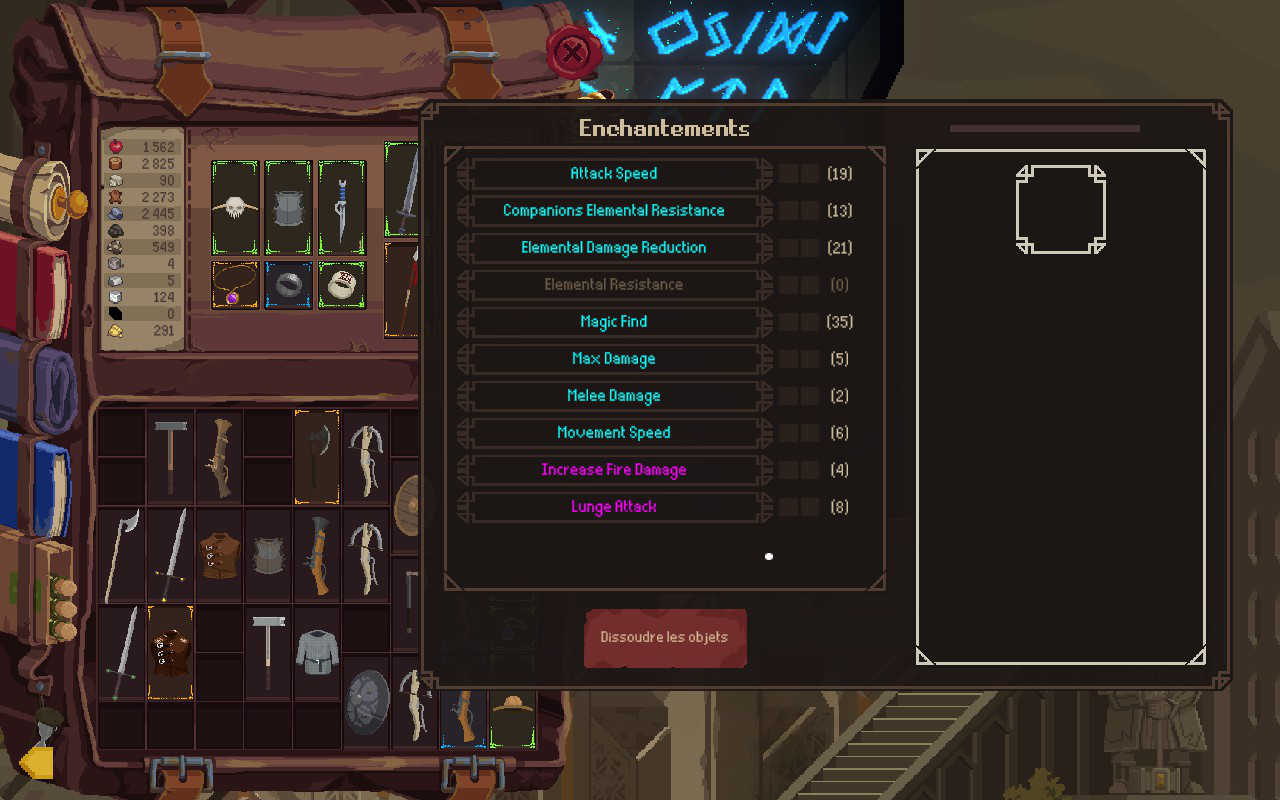 Il est aussi possible de forger ses propres armes et de les personnaliser en ajoutant des modificateurs. À la forge, vous pourrez déconstruire des objets afin de les ajouter à votre livre de recettes. Par la suite, plus vous en produirez, plus votre affinité avec ces objets sera grande. Et plus votre affinité sera grande, plus la qualité de ce que vous fabriquerez sera élevée. Vous pourrez ensuite vous rendre à la table d’enchantement avec laquelle vous pourrez une foule de modificateurs à vos objets. Je dois avouer que je ne m’attendais pas du tout à un tel degré de personnalisation, mais j’ai été ravi
