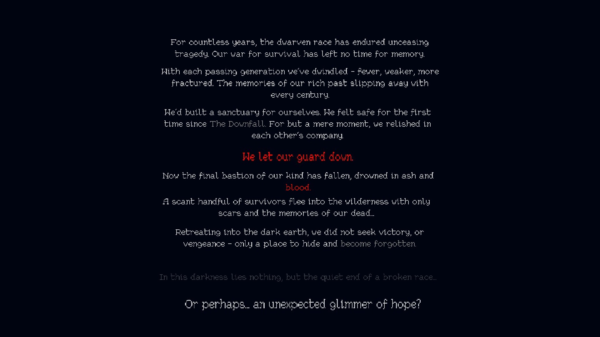 Une fois votre nain choisi, vous entamerez votre aventure. Vous apprendrez que votre race a subi de nombreuses tragédies qui l’ont affaiblie au fils des générations. Malgré tout, le clan avait réussi à s’établir et se sentait en sécurité. Mais un jour, vous avez baissé vos gardes et avez été chassé de votre royaume. Forcé à vous réfugier dans les sous-terrains, vous avez cru que tout était perdu. Cependant, un heureux hasard vous a fait découvrir une porte runique qui pourrait bien s’avérer être le salut de votre race.