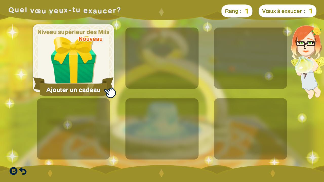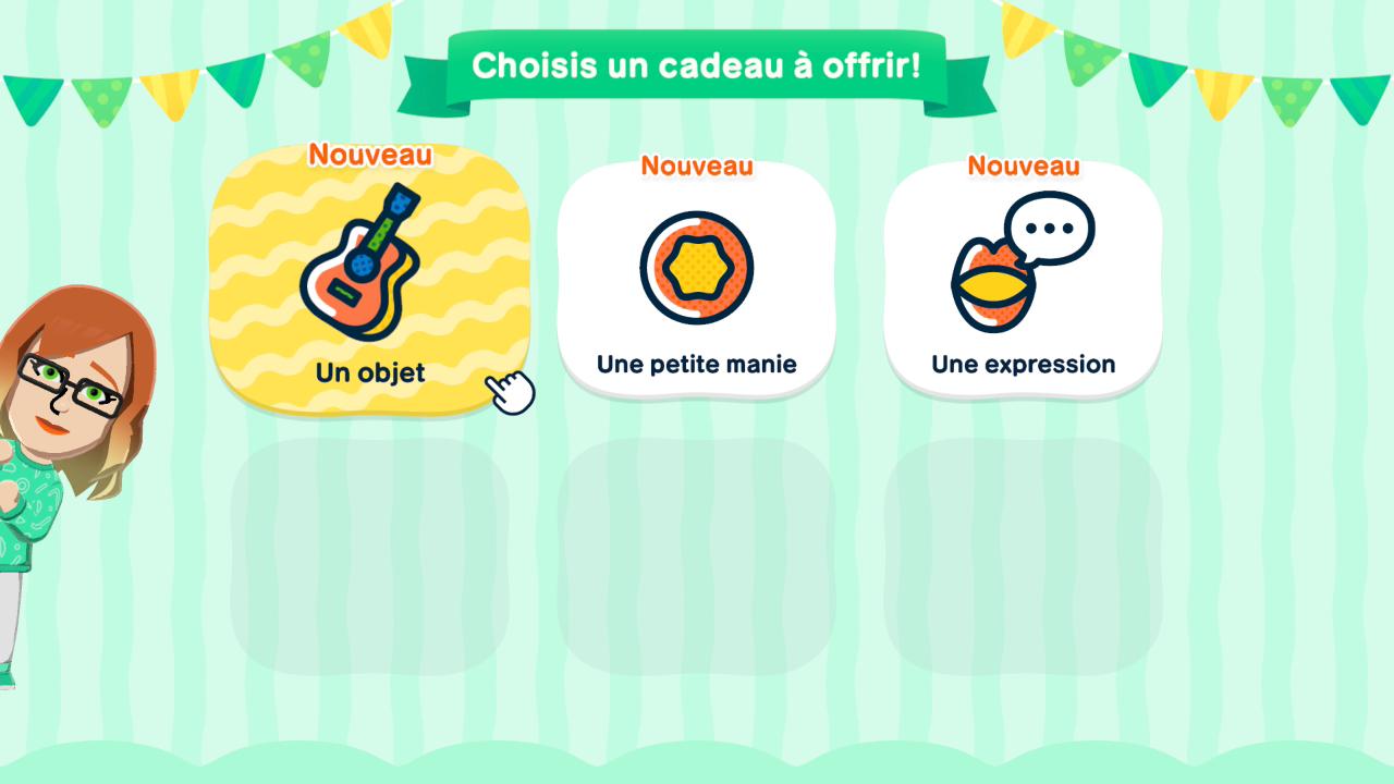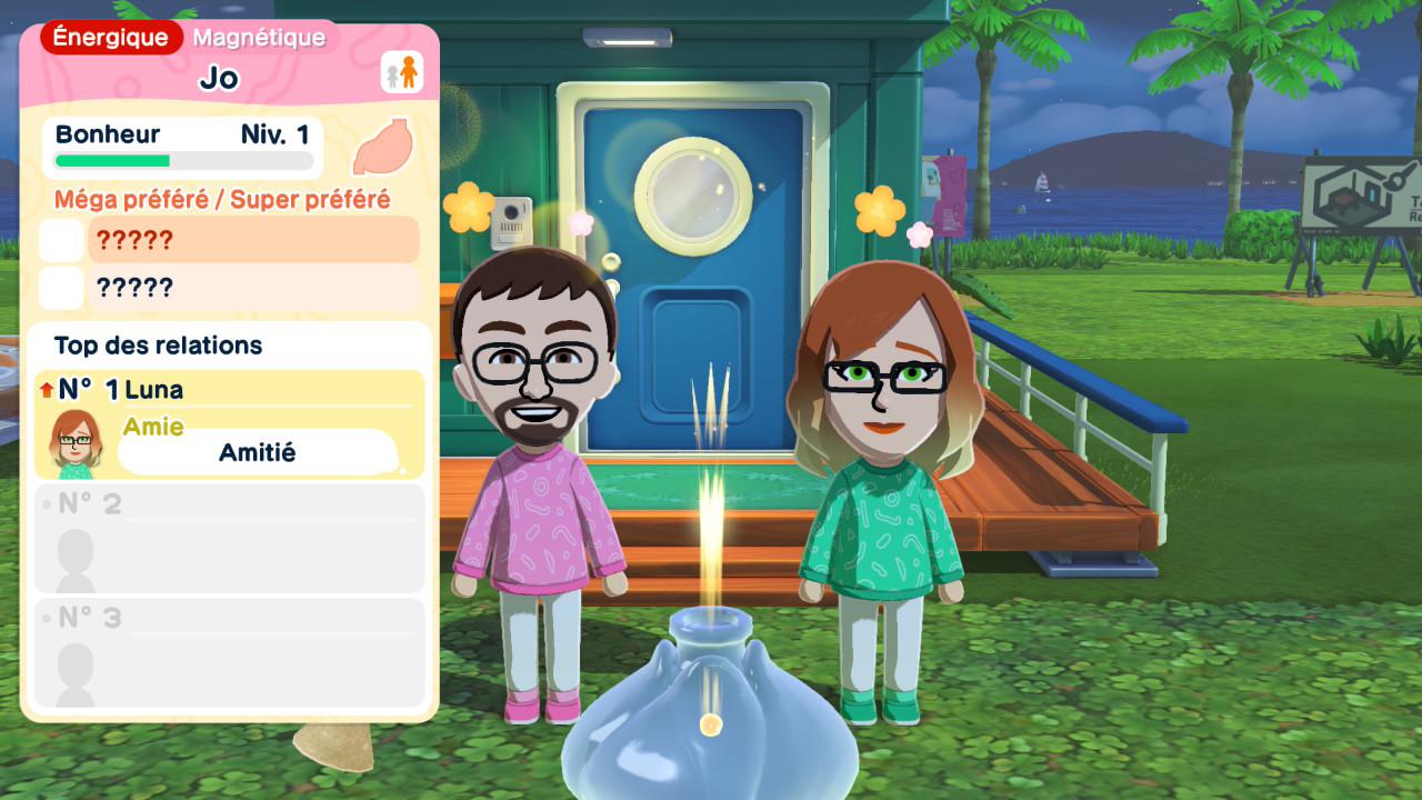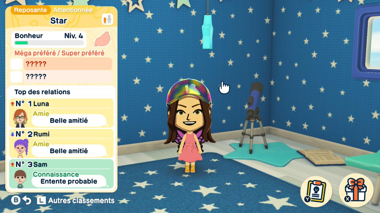 Le bonheur de vos Miis est assez important, car c’est ce qui vous permettra d’avancer dans le jeu. Vous pouvez suivre la progression du bonheur de chacun de vos résidents dans leur fiche. À chaque niveau, vous choisirez un cadeau à leur offrir en guise de récompense. Vous aurez le choix entre un objet, une petite manie pour personnaliser votre Mii, une expression et bien d’autres éléments qui s’ajouteront au fil de votre aventure.