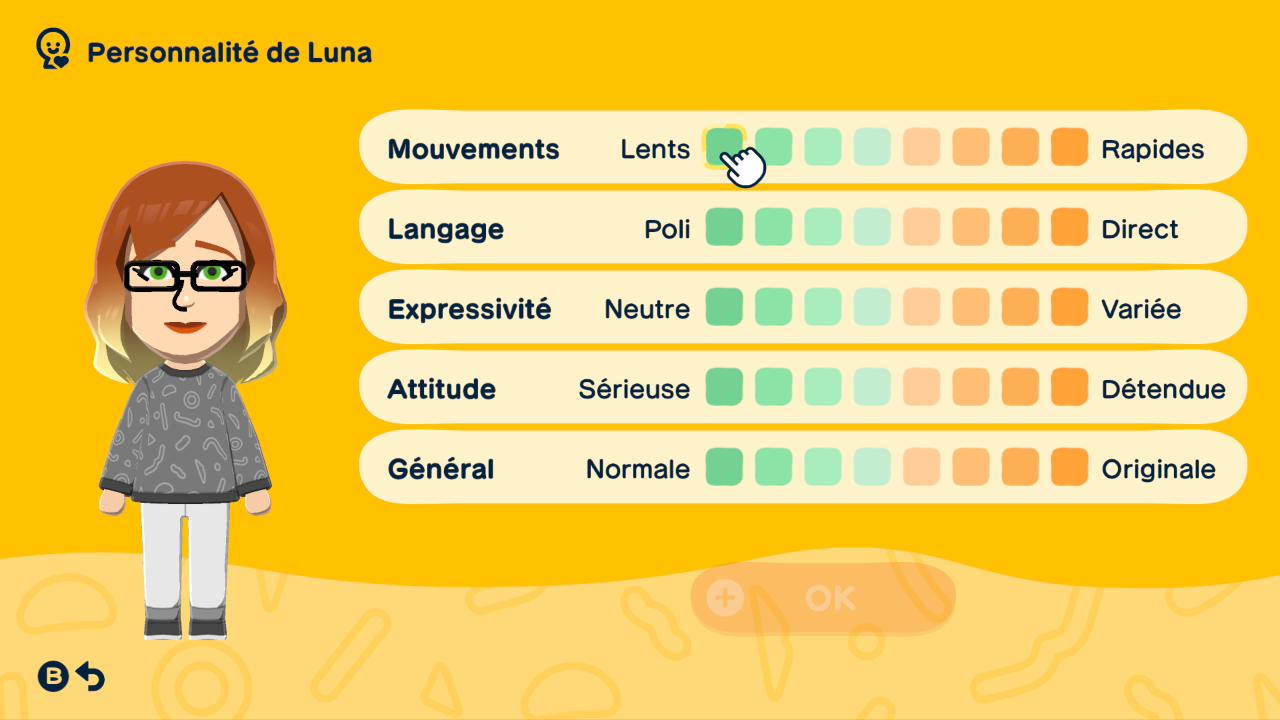 Comme je l’ai mentionné plus tôt, le jeu adopte une approche bac à sable, laissant une grande place à votre imagination, autant pour la création de vos personnages que pour la personnalisation de votre île. Commençons par la création des Miis. Pour concevoir leur visage, vous avez le choix entre l’option “avec indications », qui propose une sélection prédéfinie, ou l’option “De A à Z” qui permet de tout personnaliser avec plus de choix. Vous pouvez ensuite modifier leur morphologie, leur genre, leur voix, leur personnalité, leurs préférences amoureuses, etc. Le système de création des Miis est assez développé. J’ai d’ailleurs passé plusieurs heures avec ma fille à concevoir différents Miis et nous nous sommes bien amusés. Il est possible d’en créer jusqu’à 70, ce qui est plutôt impressionnant.